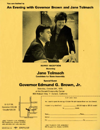 Jane McCormick Tolmach was a longtime Ventura County resident, community activist, and political leader. She initially found her footing in political affairs in the 1956 Presidential campaign and continued as Chairman of the Ventura County Democratic Central Committee (1959-1962), Women's Chairman South of the CA Democratic State Central Committee (1966-1970), and as Delegate for the Democratic National Conventions (1960, 1968). Although she is best known for being the first woman councilperson (1970-1978) and first woman mayor for the City of Oxnard (1973), Tolmach also served as a trustee for the Camarillo State Hospital, as a school board member for Oxnard High School, and was appointed to the State's Community College's Board of Governors, among other highly acclaimed positions. Tolmach became active in the human rights movements, especially in Cesar Chavez's effort to organize farm labor. She was elated when Senator Robert Kennedy joined the Presidential race in 1968 and was onstage with Kennedy and Chavez at a locally-hosted event just days before Kennedy was assassinated. After the assassination, Tolmach concentrated on environmental issues, such as the 1972 Santa Barbara Channel oil spill and the proposed Oxnard liquefied natural gas port. Always undaunted, she received a juris doctor degree from Southwestern University in 1981 and when the gambling industry tried to launch an Oxnard casino, at the age of 80+, Tolmach put together an alliance of minority leaders and fundamentalist ministers to march into a City Council meeting to protest the proposed change in zoning. This collection was donated by the family of Jane Tolmach and consists of artifacts, correspondence, documents, ephemera, and photographs. Please use the One Search feature on the main library page to search for other materials regarding this collection or our on-line finding guide. SEE THE ENVIRONMENTAL COLLECTIONS AND THE CARMEN RAMIREZ COLLECTION FOR CROSS-REFERENCING. REGARDING COPYRIGHT: SEE https://www.copyright.gov/help/faq/faq-fairuse.html OR https://ogc.harvard.edu/pages/copyright-and-fair-use IT IS INCUMBENT UPON THE RESEARCHER TO UNDERSTAND COPYRIGHT AND APPLY IT APPROPRIATELY. The Broome Library/Archives may not have copyright to certain items, and it is up to the researcher to clear copyright before reproducing such items, particularly, news articles, photographs, and artistic endeavors. The Broome Library/Archives cannot give copyright, when it does not have copyright. Researchers must also follow HIPPA. Please see the archivist for clarification. The images, documents, and oral histories posted here are for educational use only and are not to be duplicated, distributed, or reproduced, before receiving written approval from the CSUCI Archives and/or the owner/creator. With that approval, the Broome Library/Archives must be acknowledged as the source of the item. Please contact the archivist for approval and the correct citation with any reproduction request.