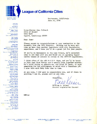 Jane McCormick Tolmach was a longtime Ventura County resident, community activist, and political leader. She initially found her footing in political affairs in the 1956 Presidential campaign and continued as Chairman of the Ventura County Democratic Central Committee (1959-1962), Women's Chairman South of the CA Democratic State Central Committee (1966-1970), and as Delegate for the Democratic National Conventions (1960, 1968). Although she is best known for being the first woman councilperson (1970-1978) and first woman mayor for the City of Oxnard (1973), Tolmach also served as a trustee for the Camarillo State Hospital, as a school board member for Oxnard High School, and was appointed to the State's Community College's Board of Governors, among other highly acclaimed positions. Tolmach became active in the human rights movements, especially in Cesar Chavez's effort to organize farm labor. She was elated when Senator Robert Kennedy joined the Presidential race in 1968 and was onstage with Kennedy and Chavez at a locally-hosted event just days before Kennedy was assassinated. After the assassination, Tolmach concentrated on environmental issues, such as the 1972 Santa Barbara Channel oil spill and the proposed Oxnard liquefied natural gas port. Always undaunted, she received a juris doctor degree from Southwestern University in 1981 and when the gambling industry tried to launch an Oxnard casino, at the age of 80+, Tolmach put together an alliance of minority leaders and fundamentalist ministers to march into a City Council meeting to protest the proposed change in zoning. This collection was donated by the family of Jane Tolmach and consists of artifacts, correspondence, documents, ephemera, and photographs. Please use the One Search feature on the main library page to search for other materials regarding this collection or our on-line finding guide. SEE THE ENVIRONMENTAL COLLECTIONS AND THE CARMEN RAMIREZ COLLECTION FOR CROSS-REFERENCING. REGARDING COPYRIGHT: SEE https://www.copyright.gov/help/faq/faq-fairuse.html OR https://ogc.harvard.edu/pages/copyright-and-fair-use IT IS INCUMBENT UPON THE RESEARCHER TO UNDERSTAND COPYRIGHT AND APPLY IT APPROPRIATELY. The Broome Library/Archives may not have copyright to certain items, and it is up to the researcher to clear copyright before reproducing such items, particularly, news articles, photographs, and artistic endeavors. The Broome Library/Archives cannot give copyright, when it does not have copyright. Researchers must also follow HIPPA. Please see the archivist for clarification. The images, documents, and oral histories posted here are for educational use only and are not to be duplicated, distributed, or reproduced, before receiving written approval from the CSUCI Archives and/or the owner/creator. With that approval, the Broome Library/Archives must be acknowledged as the source of the item. Please contact the archivist for approval and the correct citation with any reproduction request.