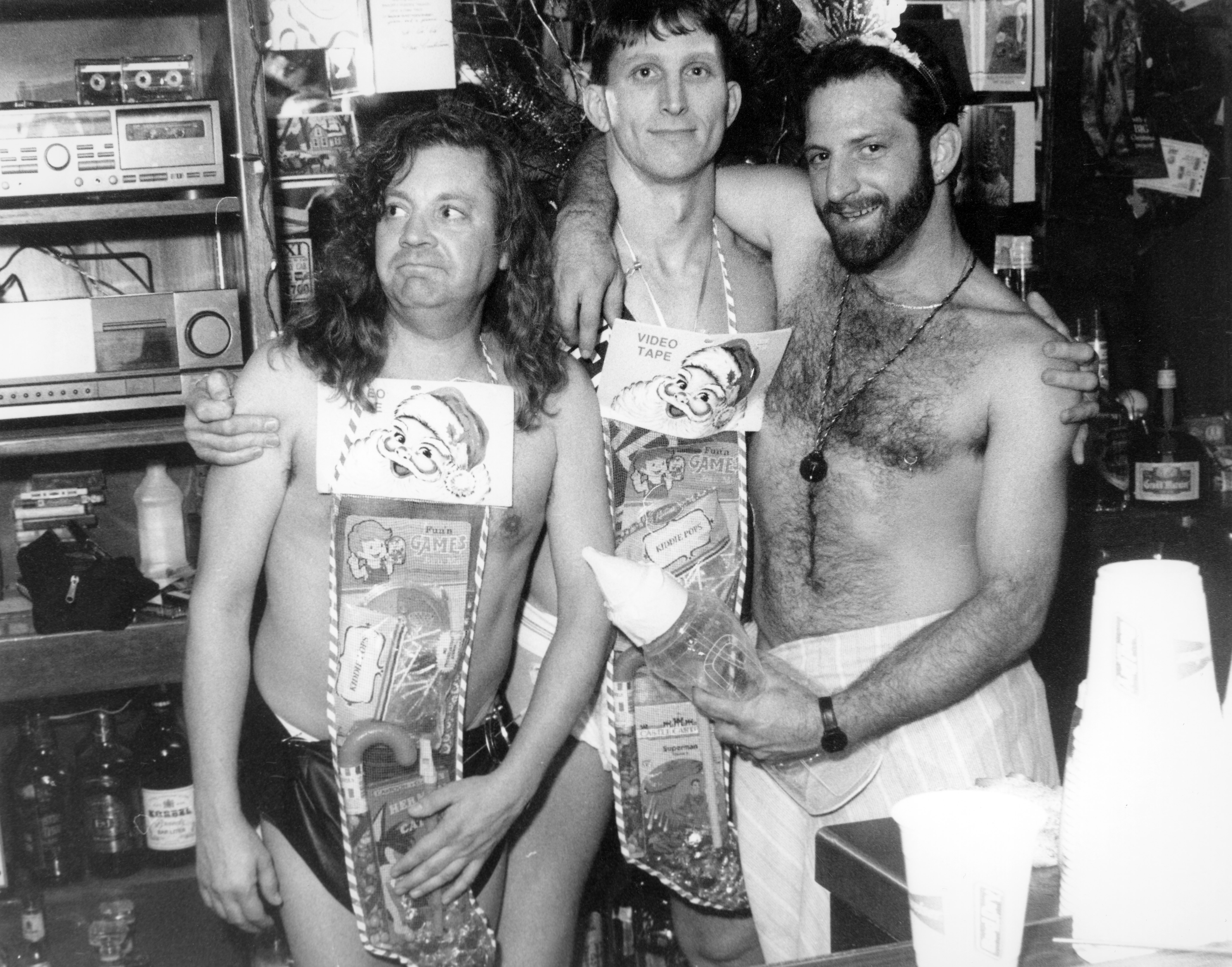 Photograph shows three partially clothed men. The man on the left appears to be wearing a dark colored diaper and has a store bought netted Christmas stocking filled with gifts hanging around his neck. The man in the middle wears a jockstrap and a similar Christmas stocking around his neck. The man on the right appears to be wearing a skirt and has a oversized baby bottle in his hand.