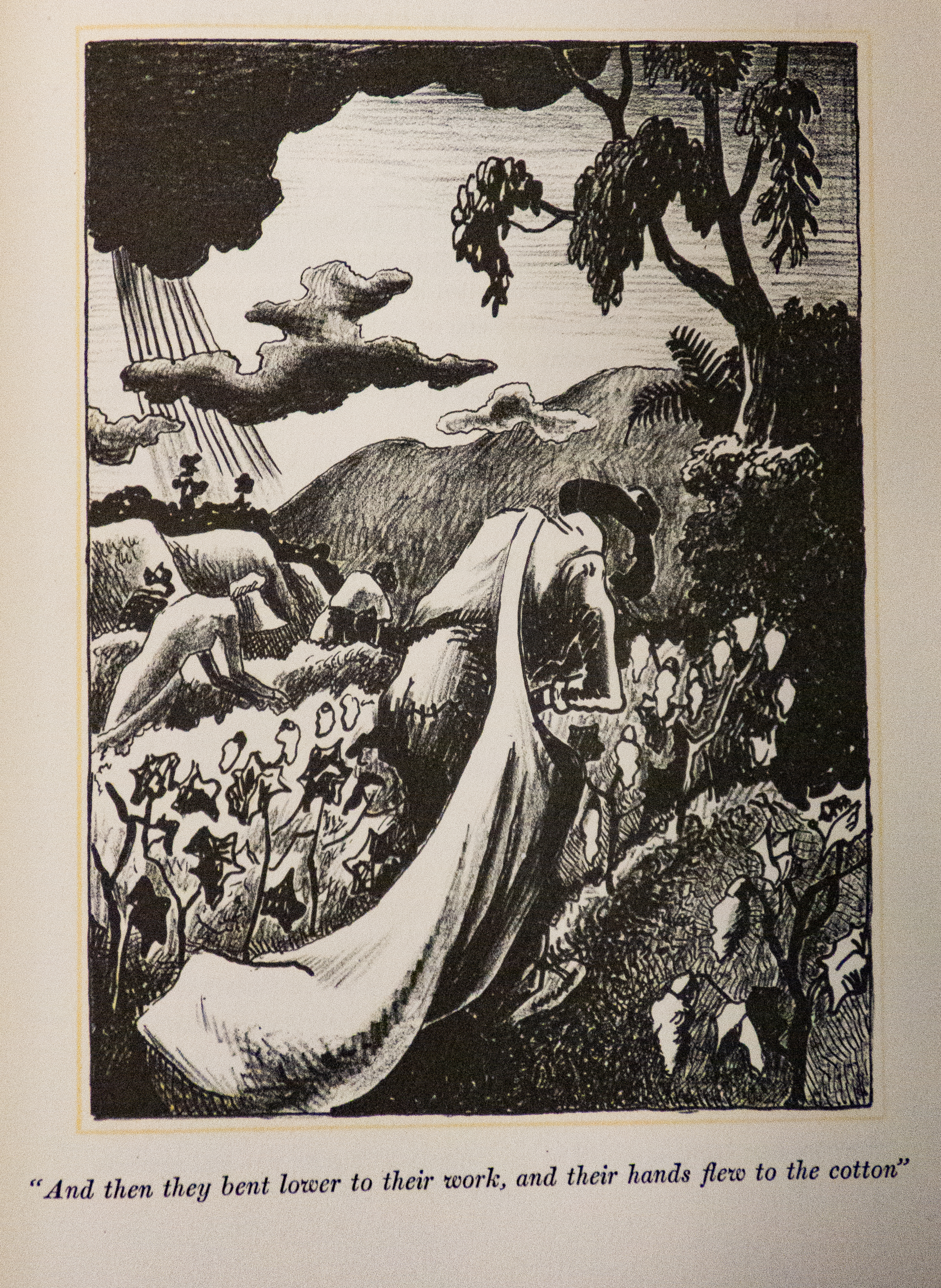 Workers picking cotton from The Grapes of Wrath, v.2,p.529, illustrated edition, by Thomas Hart Benton, a native of eastern Oklahoma, who was assigned to draw archetypal Oklahomans for 20th Century Fox as the studio believed that would make the casting more accurate. "And then they bent lower to their work, and their hands flew to the cotton." "Cotton pickers wanted-placards on the road, handbills out..." "Now the bag is heavy, boost it along, set your hips and tow it along, like a work horse."