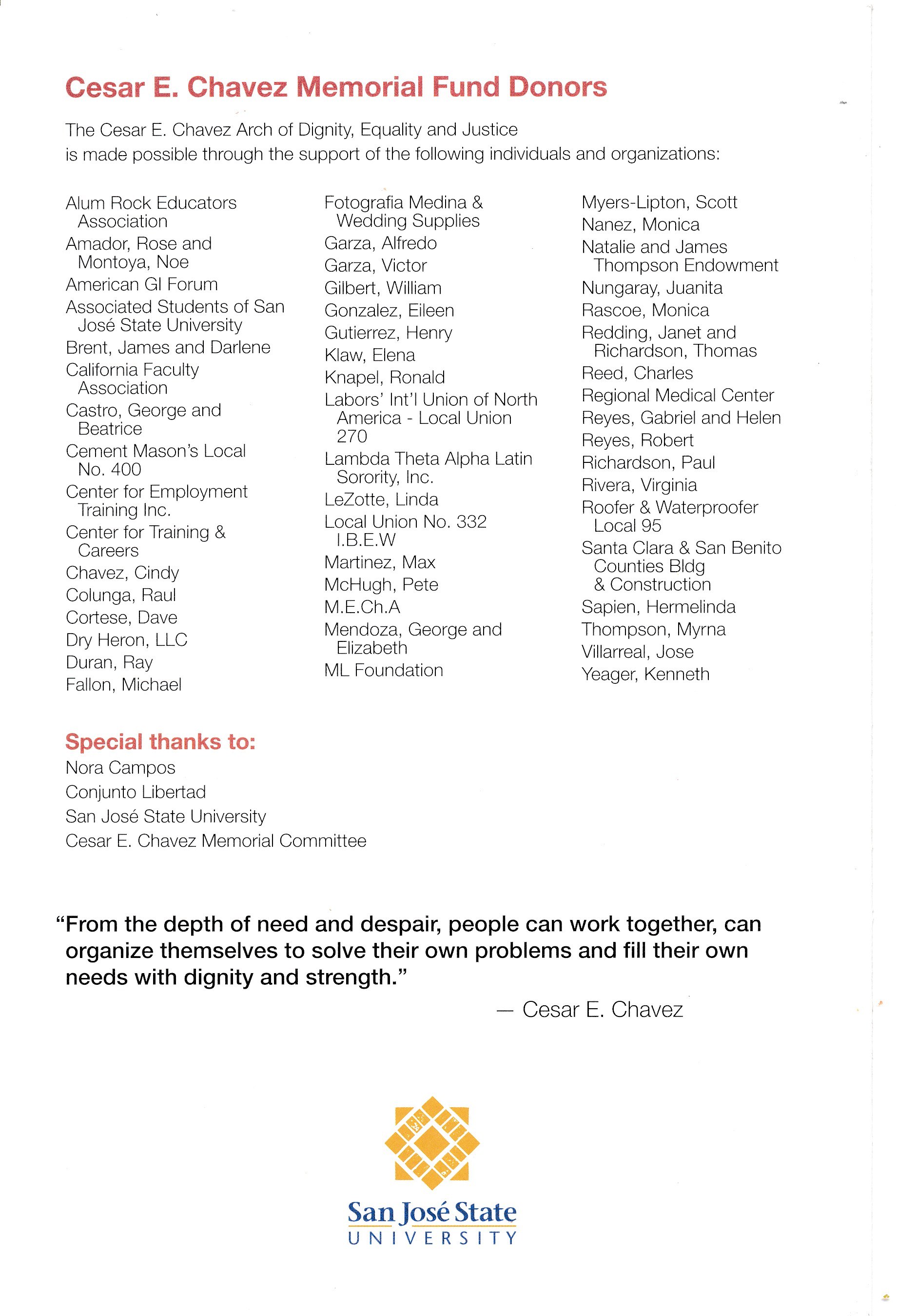 Program for the Groundbreaking Ceremony for th San José State University Cesar E. Chavez Arch of Dignity, Equality, and Justice. Held on Thursdy, May 5, 2005 on El Paseo de Cesar E. Chavez. The Master of Ceremonies was Rigo Chacon (South Bay Journalist and Philanthropist). This event includes a Innvocation by Msgr. Eugene Boyle (Diocese of San José), Welcome by Don W. Kassing (President, SJSU), Remarks by Cindy Chavez (Vice Mayor of San José), Victor Garza (Member, Cesar E. Chaves Memorial Committee and Chair, Raza Roundtable), Judith Baca (Artist, Arch of Dignity, Equality, and Justice), and Paul Chavez. Music was provided by Conjunto Libertad.