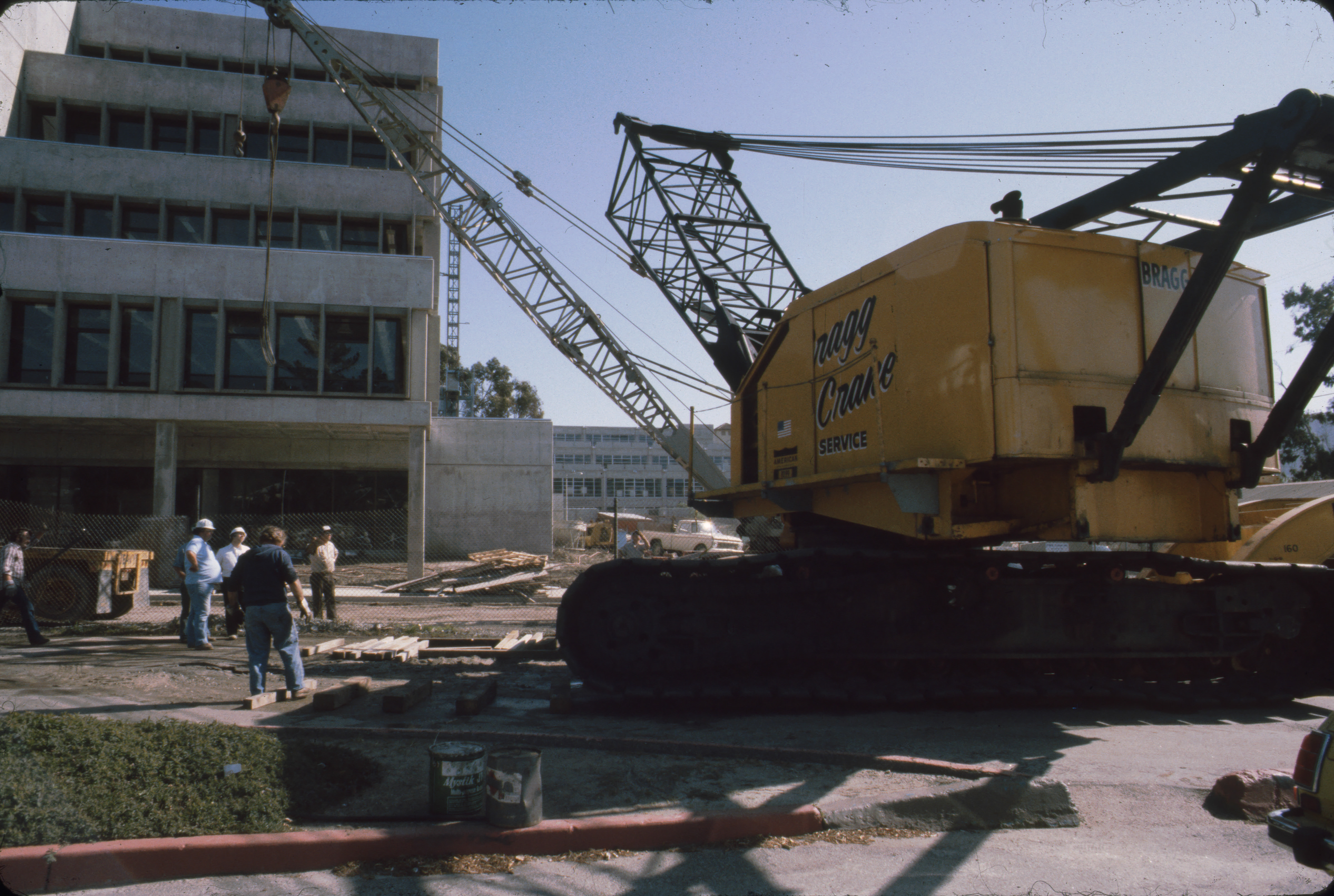 The "Cragg Crane" used during construction of Kennedy Library. The completed exterior of the library is visible in the background. Construction workers are standing around the crane.