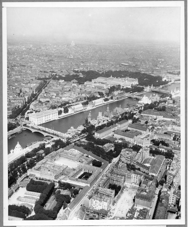 Caption on card: "You could see, in the distance, surrounded by trees, the strange Porte Monumentale... near it the Alexander III Bridge and the new Grand and Petit palaces for the art exhibtis... and, crowded in on the near side of the Seine, the foreign pavilions..."
