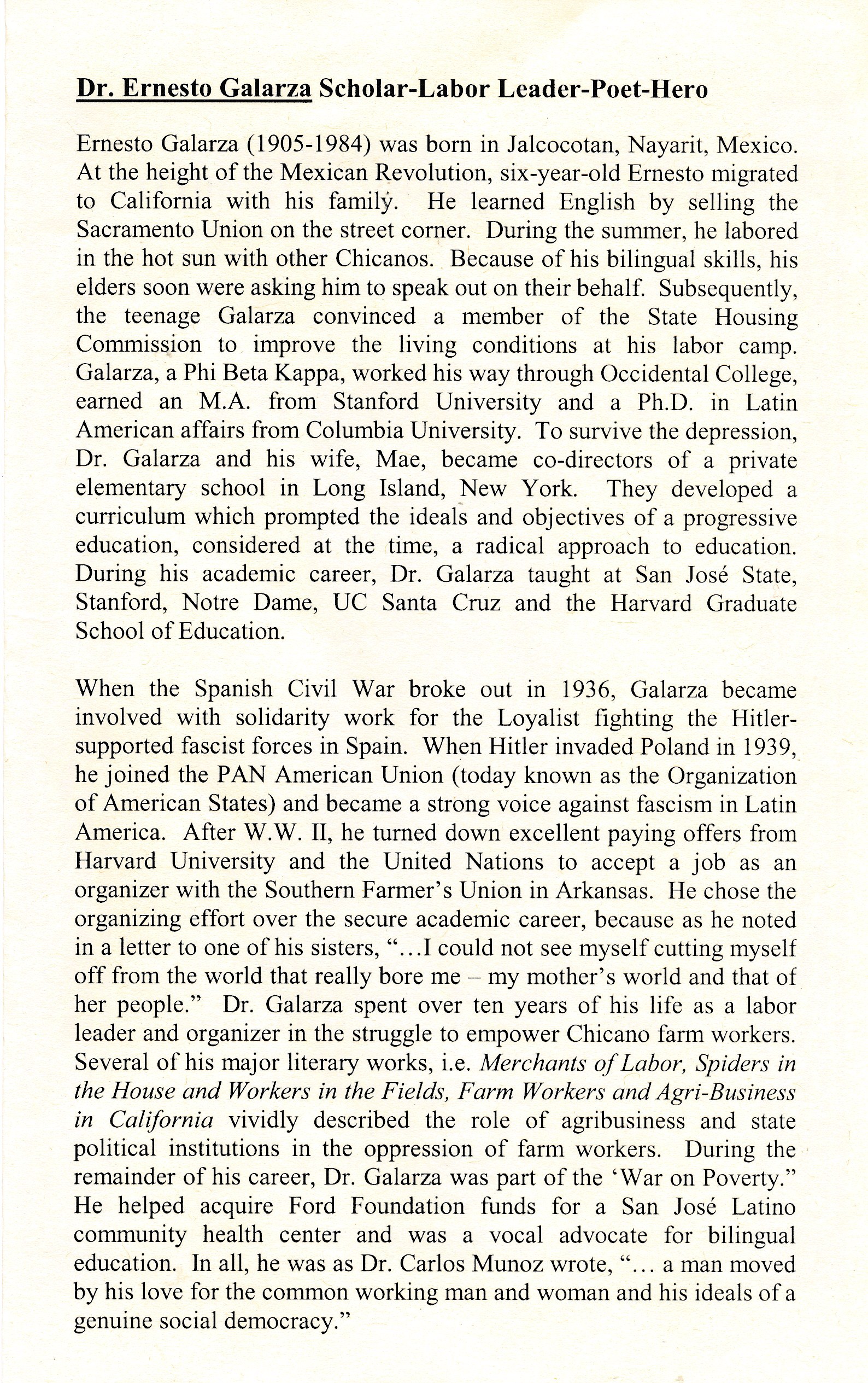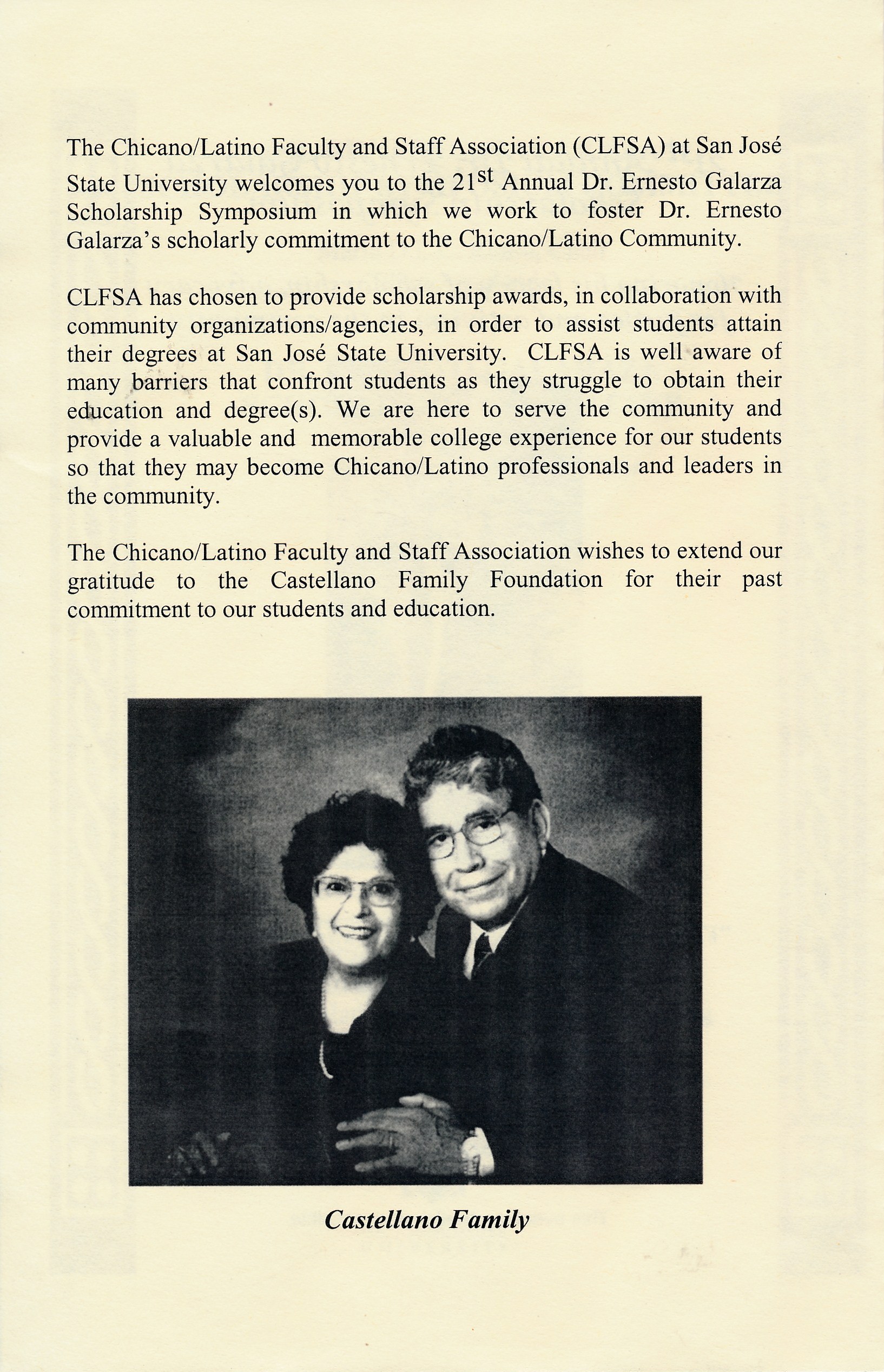 Program for the 21st Annual Dr. Ernesto Galarza Scholarship Symposium, held at San Jose State University on Tuesday, April 25, 2006 at 5:30 PM – 8:00 PM. The event included a Welcome/Opening Remarks by Dr. Henry Gutierrez (President, CLFSA), Dr. Ana Lomas (Director of Educational Services, Eastside Union School District), and Maria D.L.C. Romo (Chair, Dr. Ernesto Galarza Scholarship Symposium Chair), Presentation of Scholarships by the Dr. Ernesto Galarza Scholarship Committee (Dr. Julia Curry Rodriguez – Chair, Dr. Maria Alaniz, Peggy Cabrera, Dr. Dolores Mena, and Patricia Gutierrez), Keynote Address by Jonathan Alcantar (Dr. Ernesto Galarza Scholarship Recipient), and Closing Remarks by Dr. Henry Gutierrez. Eight awards were presented: Dr. Ernesto Galarza Scholarship, Cesar E. Chavez Scholarship, Simon-Beatriz Scholarship, Jose Antonio Burciaga Scholarship, Castellano Family Foundation Scholarship, Northern California FOCO of the National Association for Chicana/Chicano Studies Scholarship (2 awards), and Marisol Perez Memorial Scholarship.