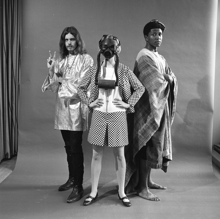 Photo shoot of three students; two men and a woman. The white man shown on the left is wearing a poncho and flashing the peace sign with his fingers; in the center is a woman wearing a gas man; on the right is an African American man dressed in cultural African dress. This shoot was likely tied to the Survival Faire