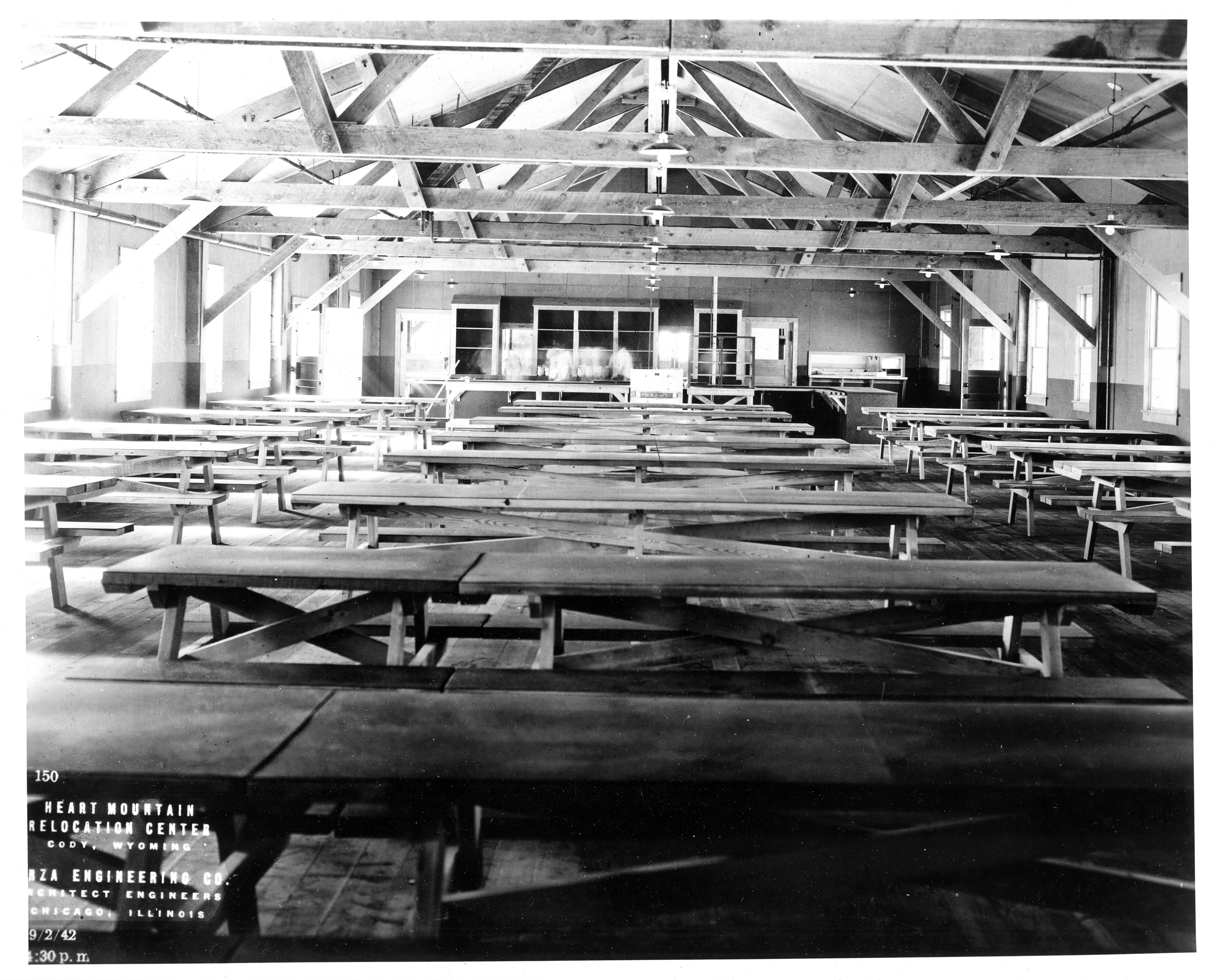 Photograph shows an empty mess hall in a relocation center hospital, at Heart Mountain Relocation Center, completed by Army Engineers.