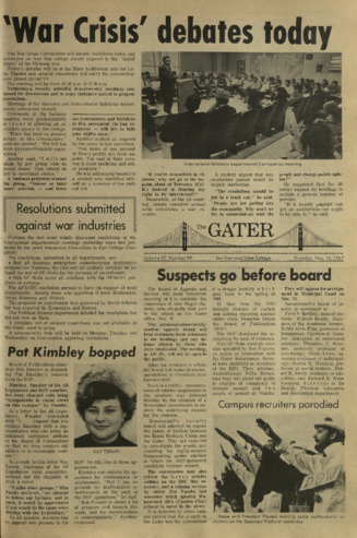 The Gater for the Fall 1966 - Feb 1972 was published daily during the regular academic year and weekly during the summer by the Board of Publications for the Associated Students of San Francisco State College. This student newspaper was edited by Diran Karaguezian with managing editor Dave Richmond, city editor Greg de Giere, and photo editor Hank Smith. The Daily Gater spotlighted campus news and events and includes advertisements. Best copy available
