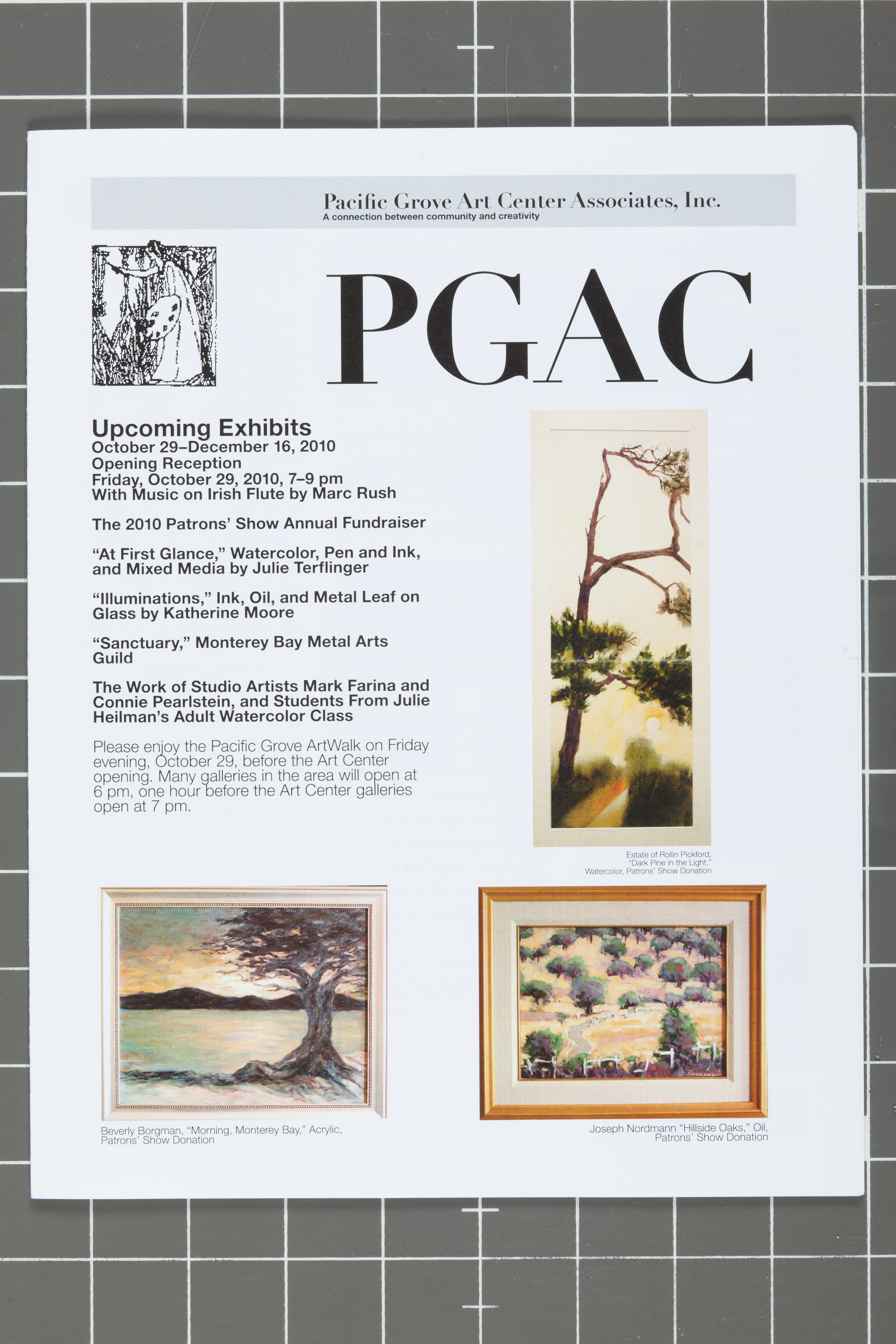 Newsletter Detailing Upcoming Exhibits at the Pacific Grove Art Center Including one person show by Rollin Pickford.