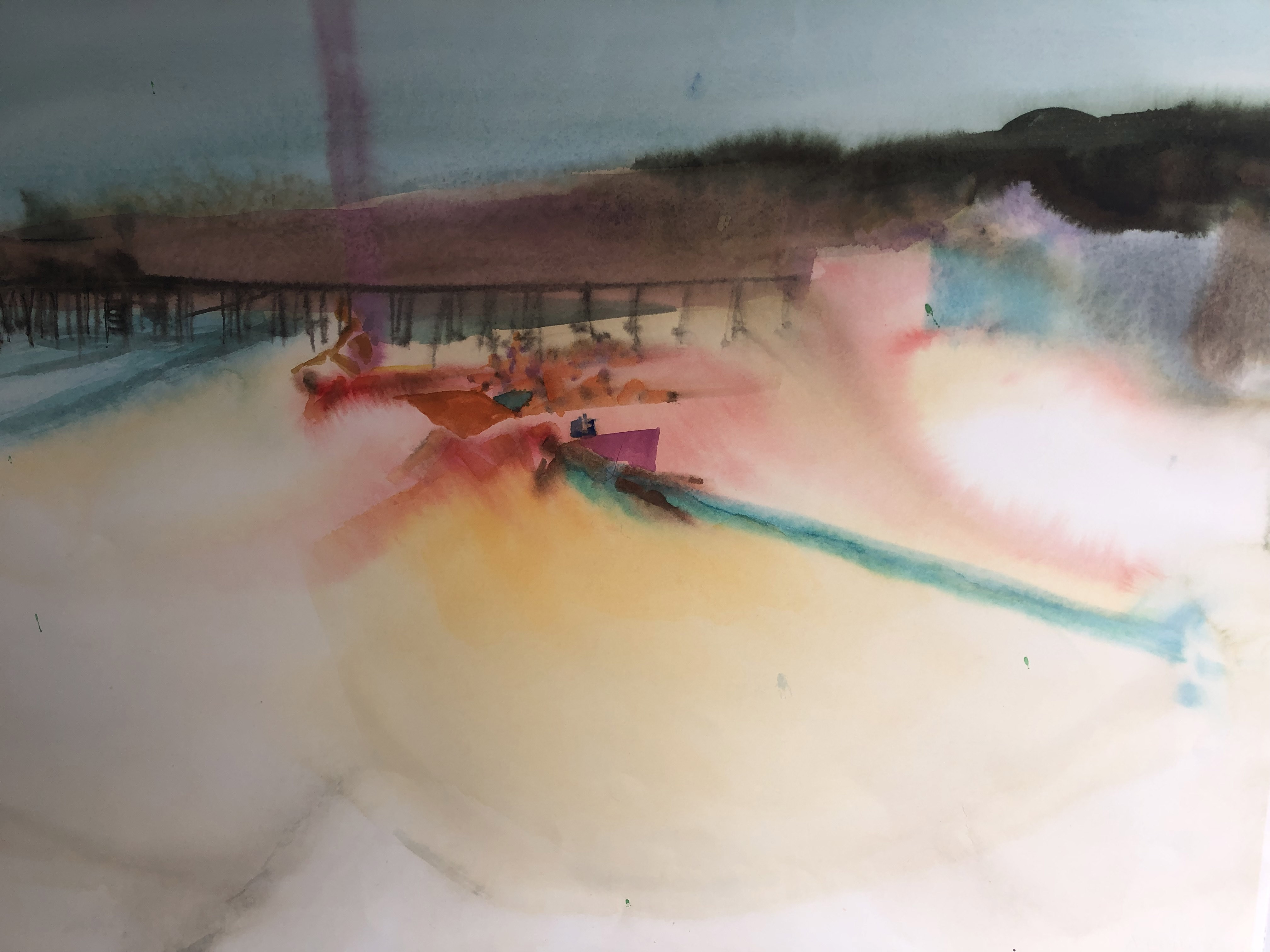 pier, figures on beach, bright streaks