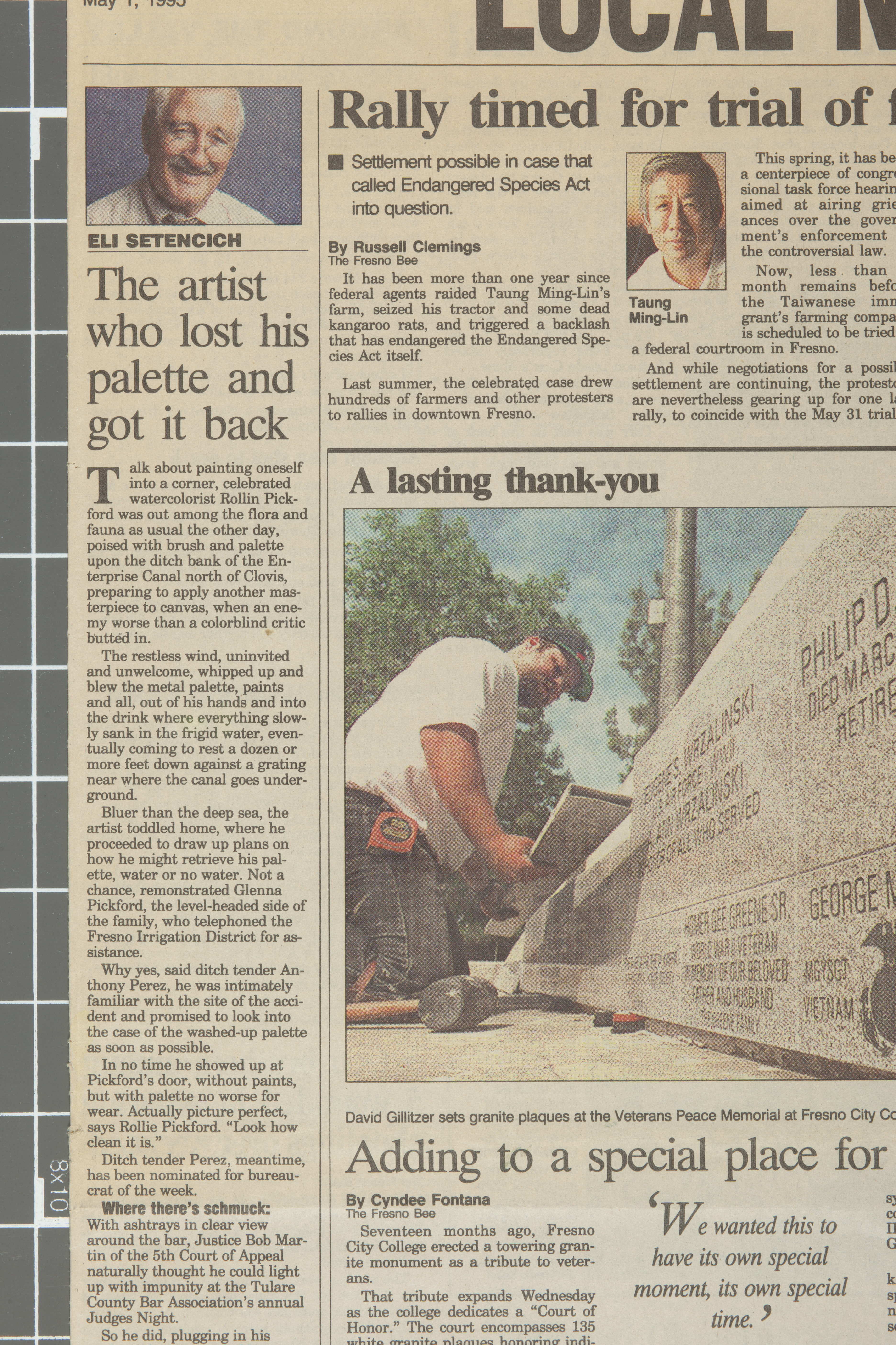 Eli Setencich column about Rollin Pickford losing his palette while painting and later having it returned by a field worker.