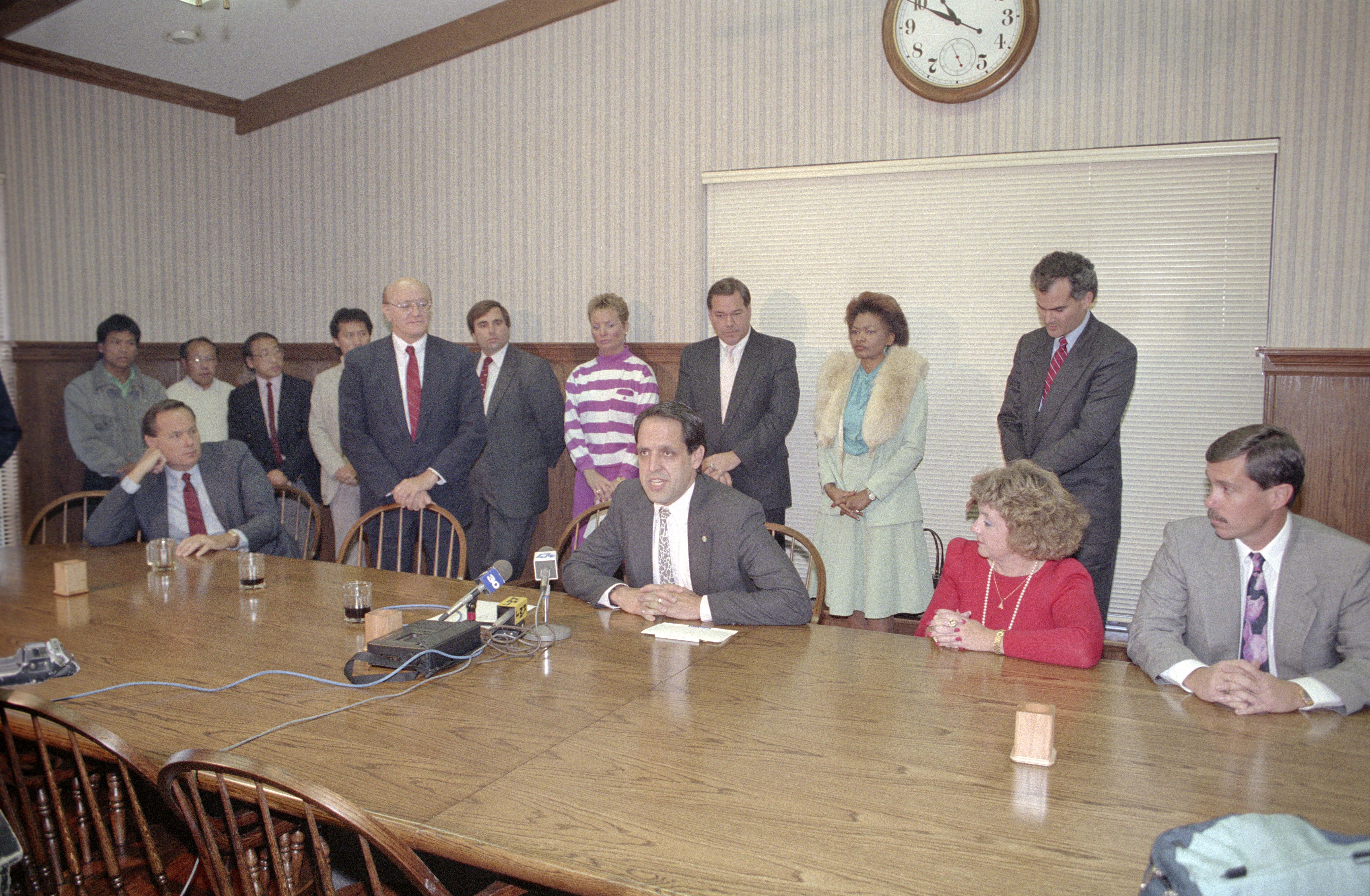 Seated: Don Fischbach, Howard Watkins speaking, Judy Soley and ?; Standing Hmong Community representatives; Arlo Smith, Mike Idiart, ?, ?, ? and Tom Bohigian