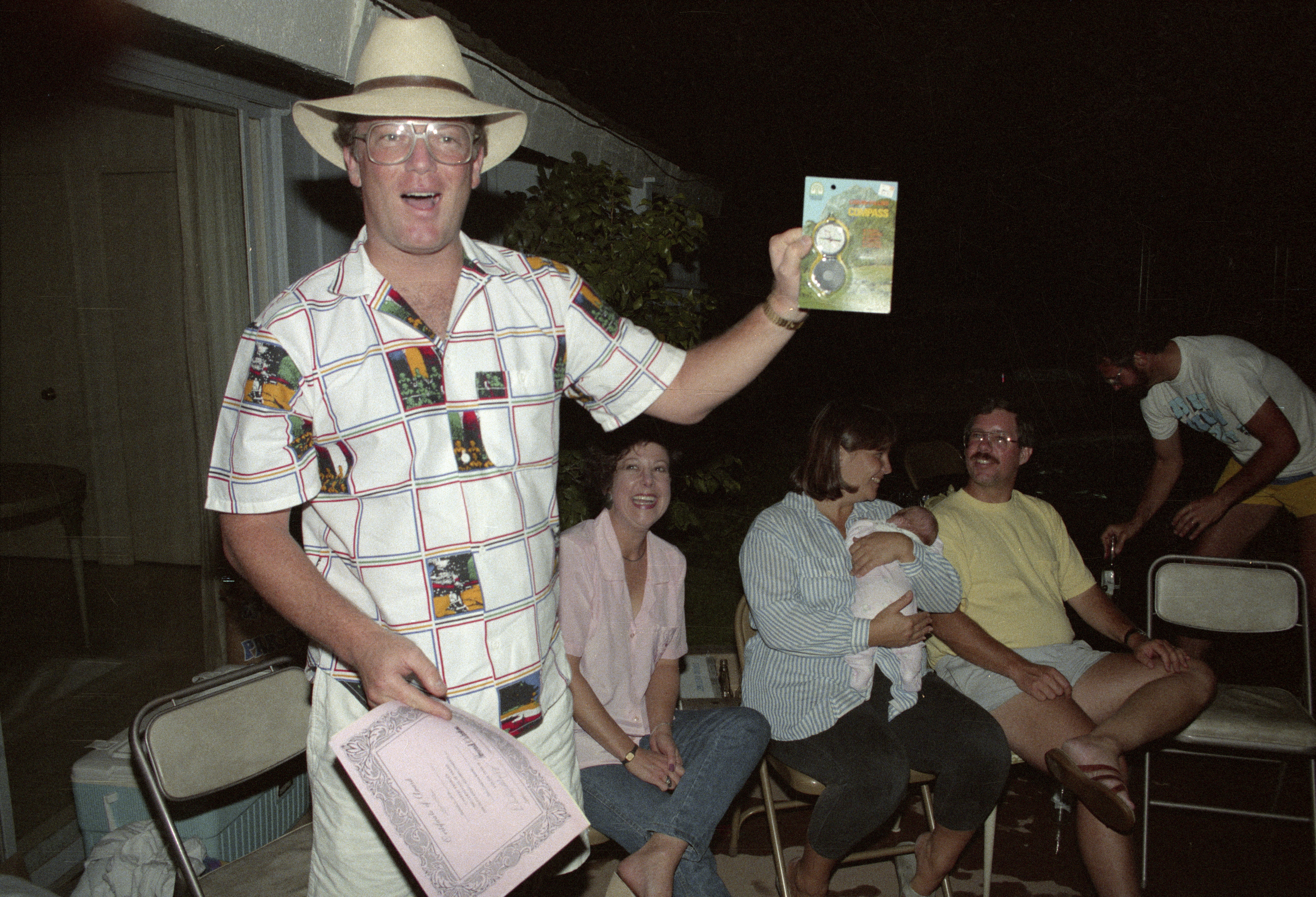 Phil Jay holding up compass gift; background: Maureen Walsh, Jane Kuhn holding baby, Jeff Kuhn, Wes Merritt