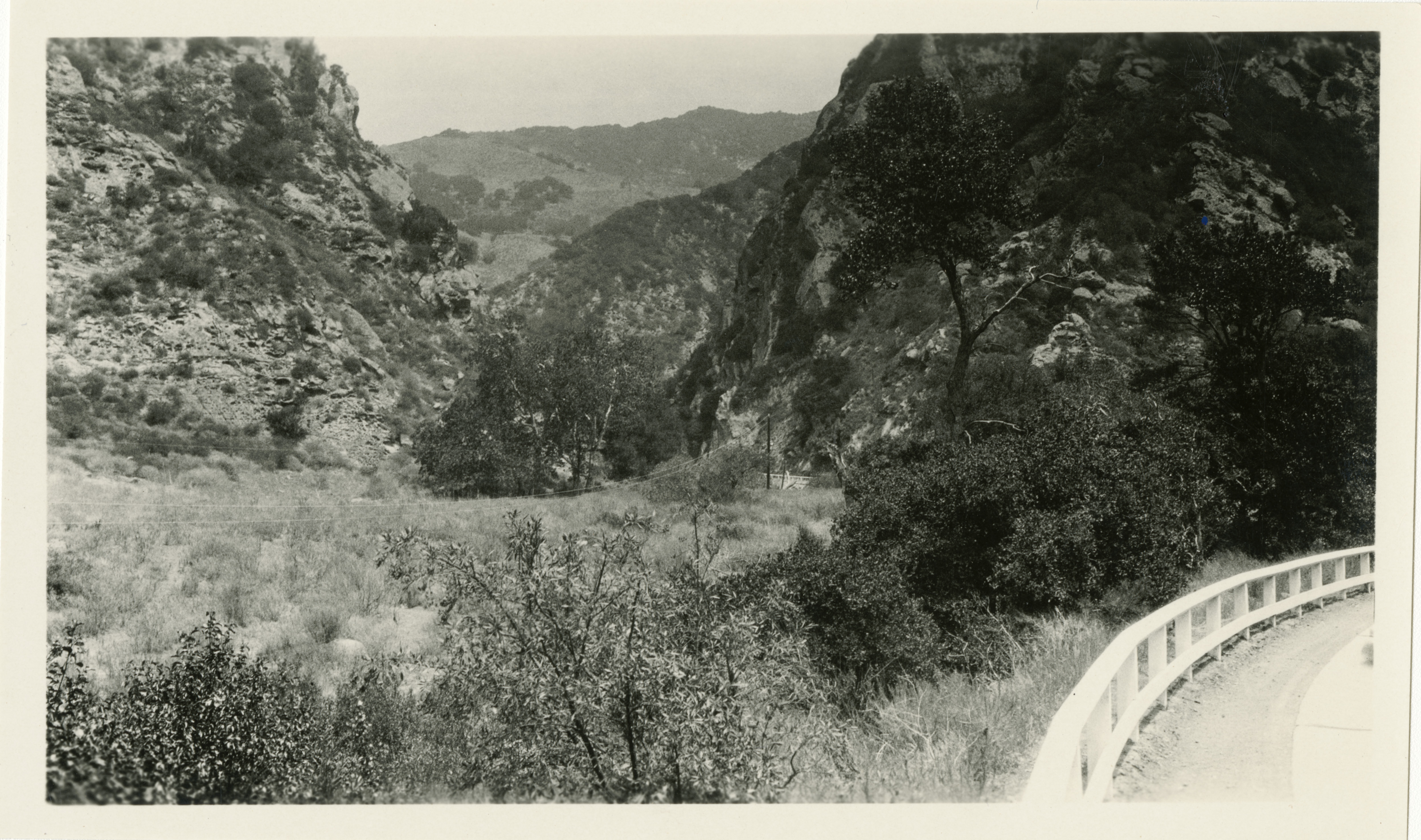 View of the Gaviota Pass, travelling from Santa Barbara towards San Luis Obispo. The road can be glimpsed continuing towards the pass in the center of the image.