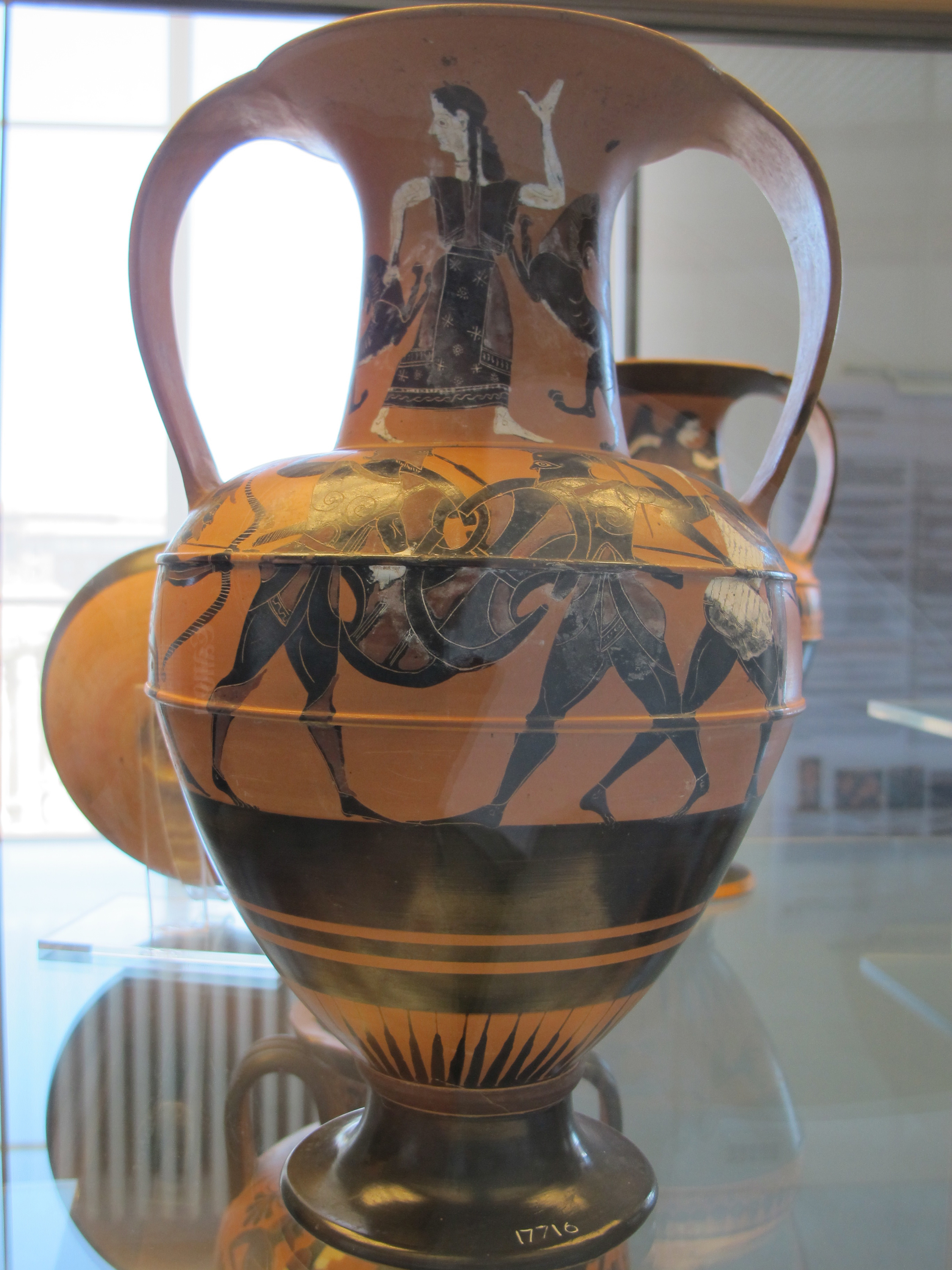 On the neck: Dionysus and a maenad/maenads with lions. On the body: battle. Signed by the potter Nikosthenes.