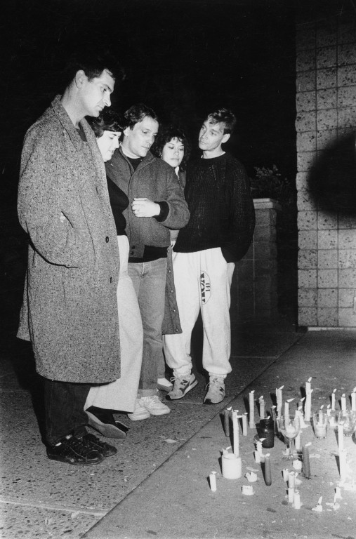 Photograph shows a night scene with five people standing beside and looking down at a group of lit candles on the sidewalk.