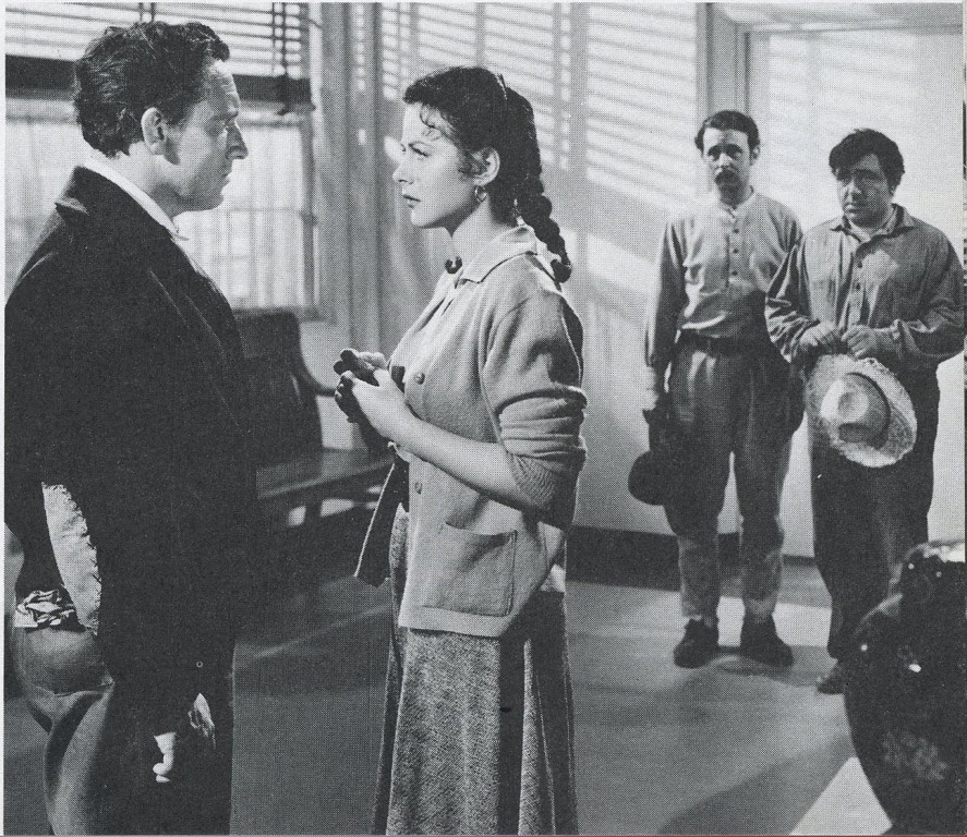 Pilon (Spencer Tracy) speaking with Dolores 'Sweets' Ramirez (Hedy Lamarr) as Jose Maria Corcoran (John Qualen) and Pablo (Akim Tamiroff) look on in the background during MGM's adaptation of John Steinbeck's novel. RESTRICTED USE Digital copy only. No hard copy.