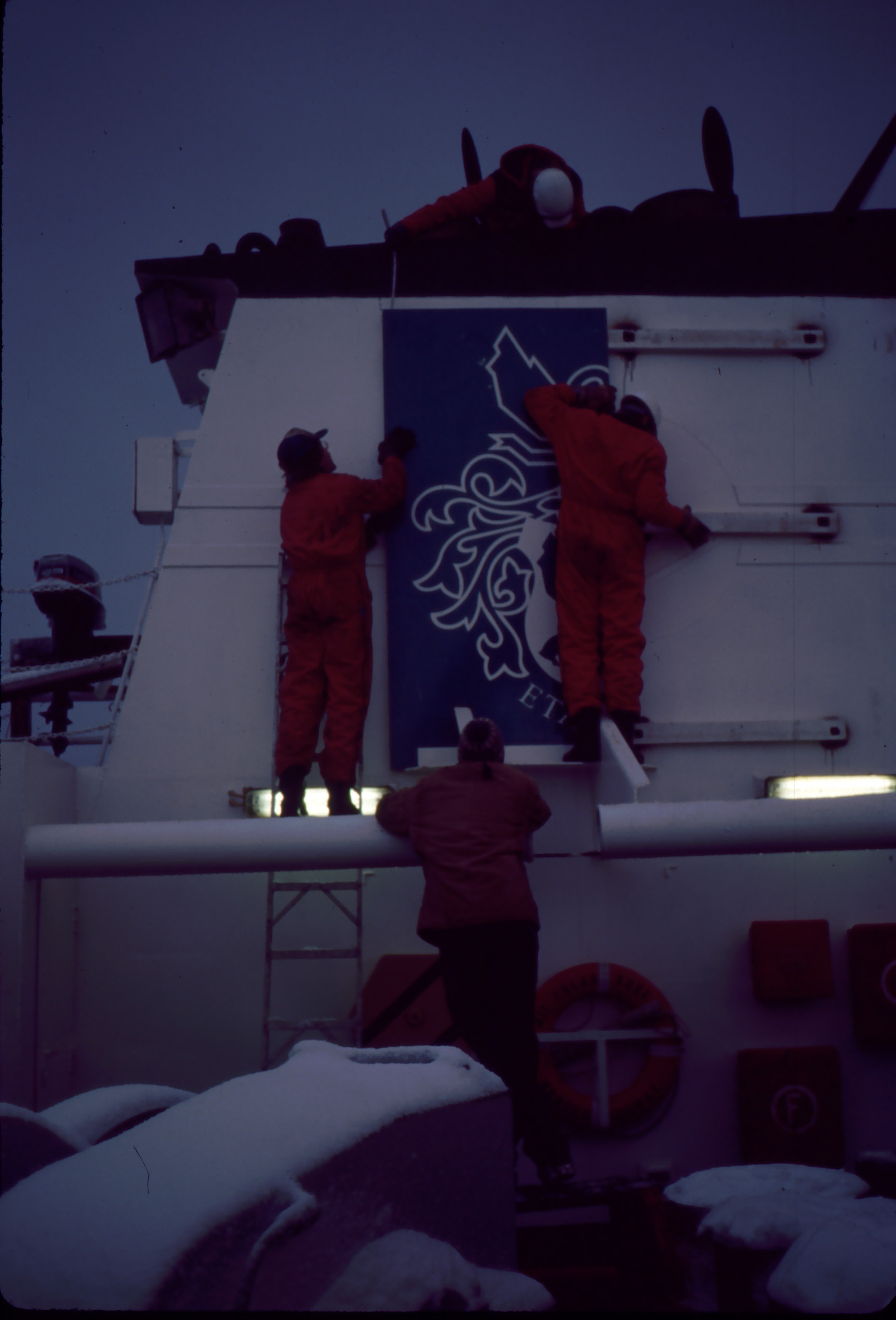 Crew putting up the Rieber shipping logo for pictures
