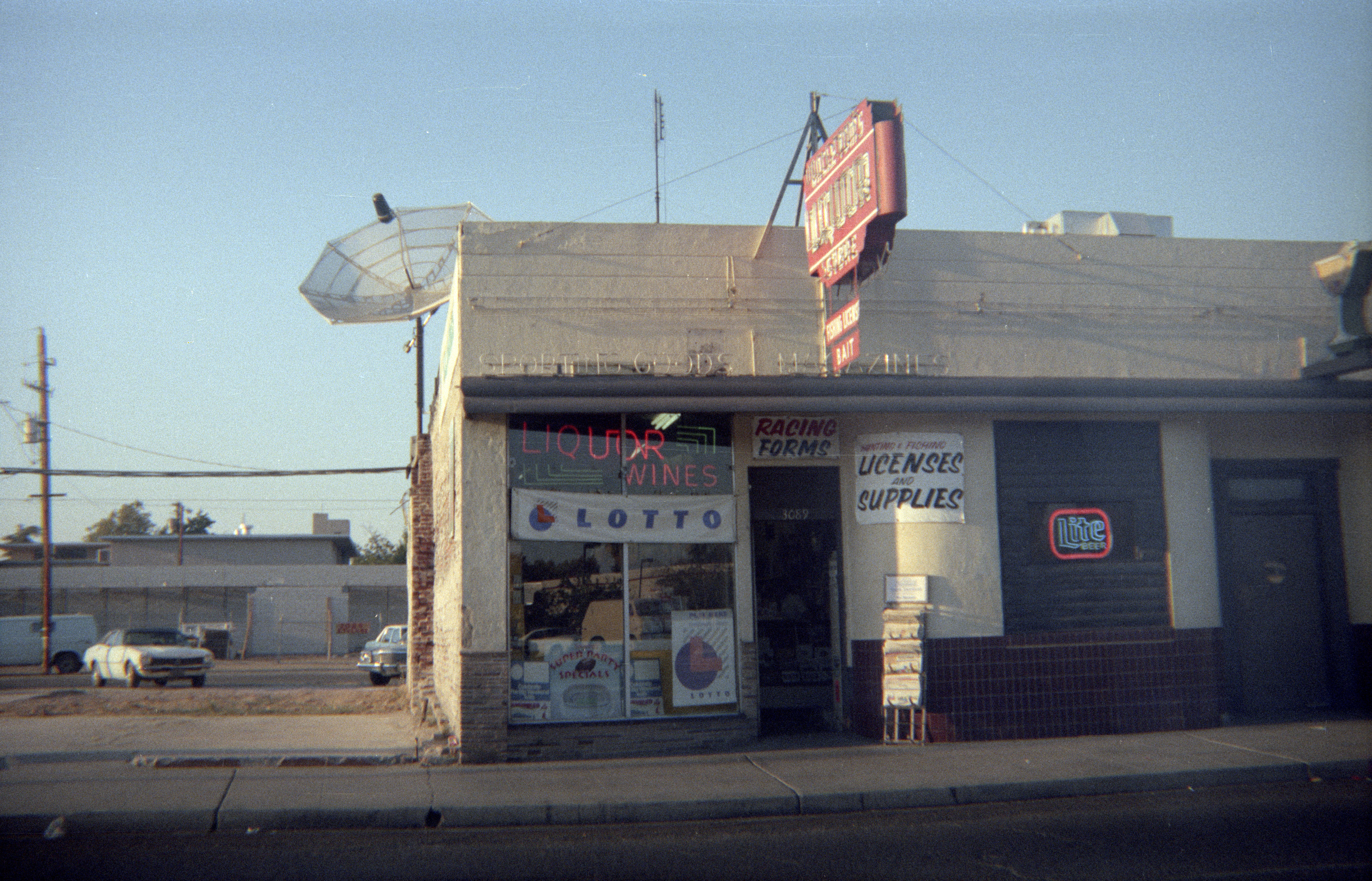 Right on the NW corner of Tulare and First Streets; lots of signage; front side: Lotto, Licenses; newspapers, Lite Beer