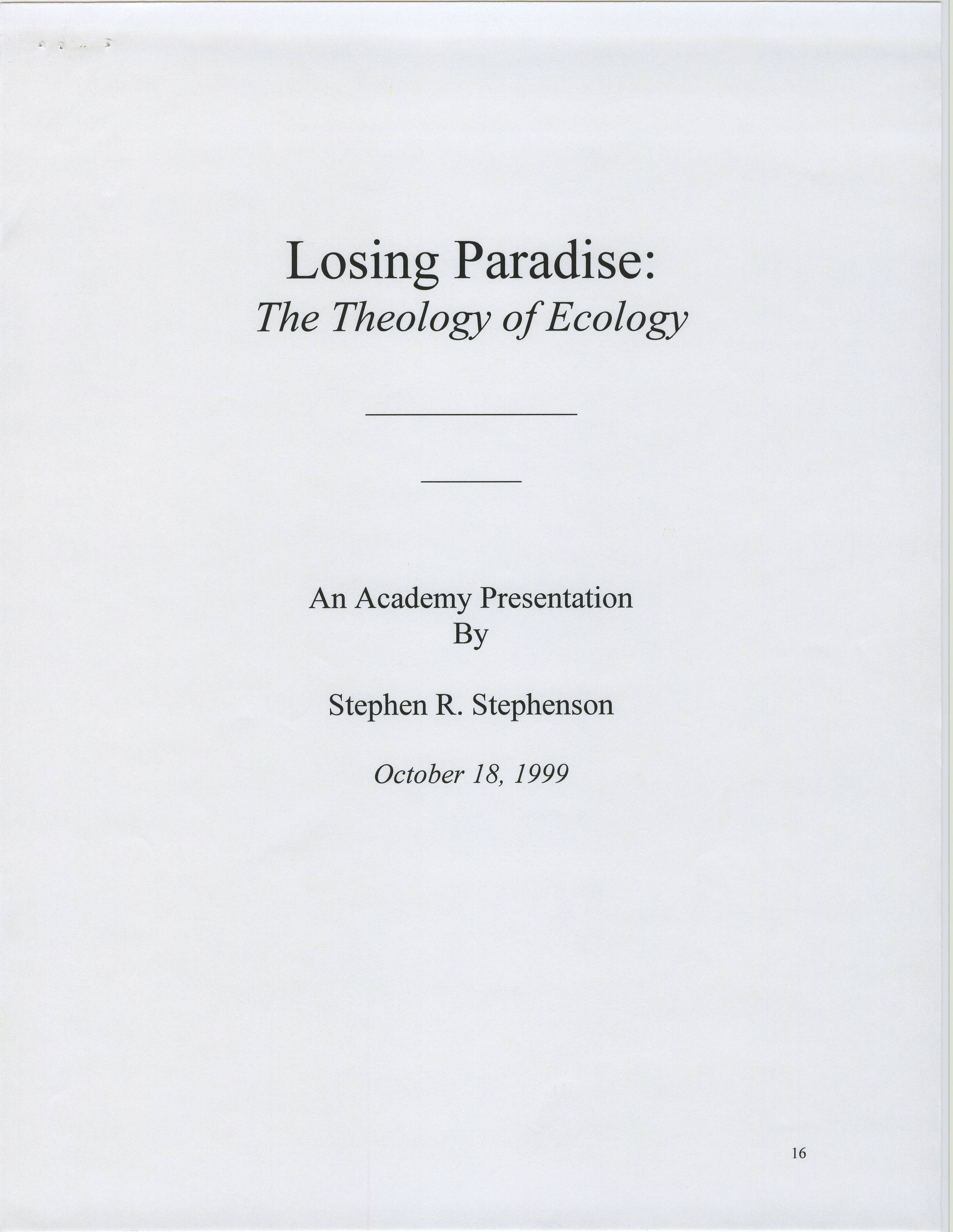 Losing Paradise: The Theology of Ecology