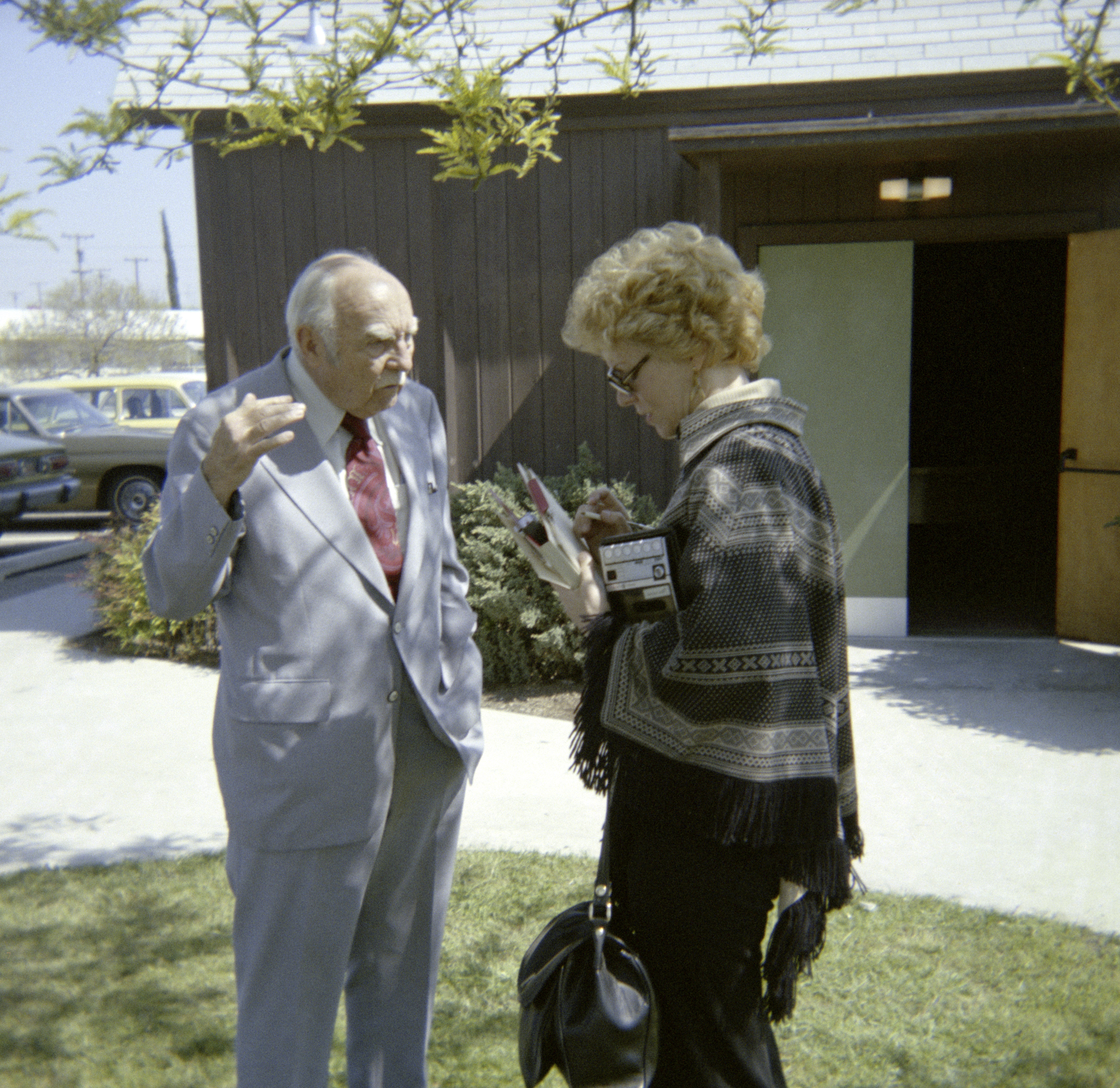 Channel 30 News reporter Karen Humphrey interviewing Rev. Fritchman at Unitarian Church of Fresno Used wired mic; 4144 N. Millbrook Ave., Fresno