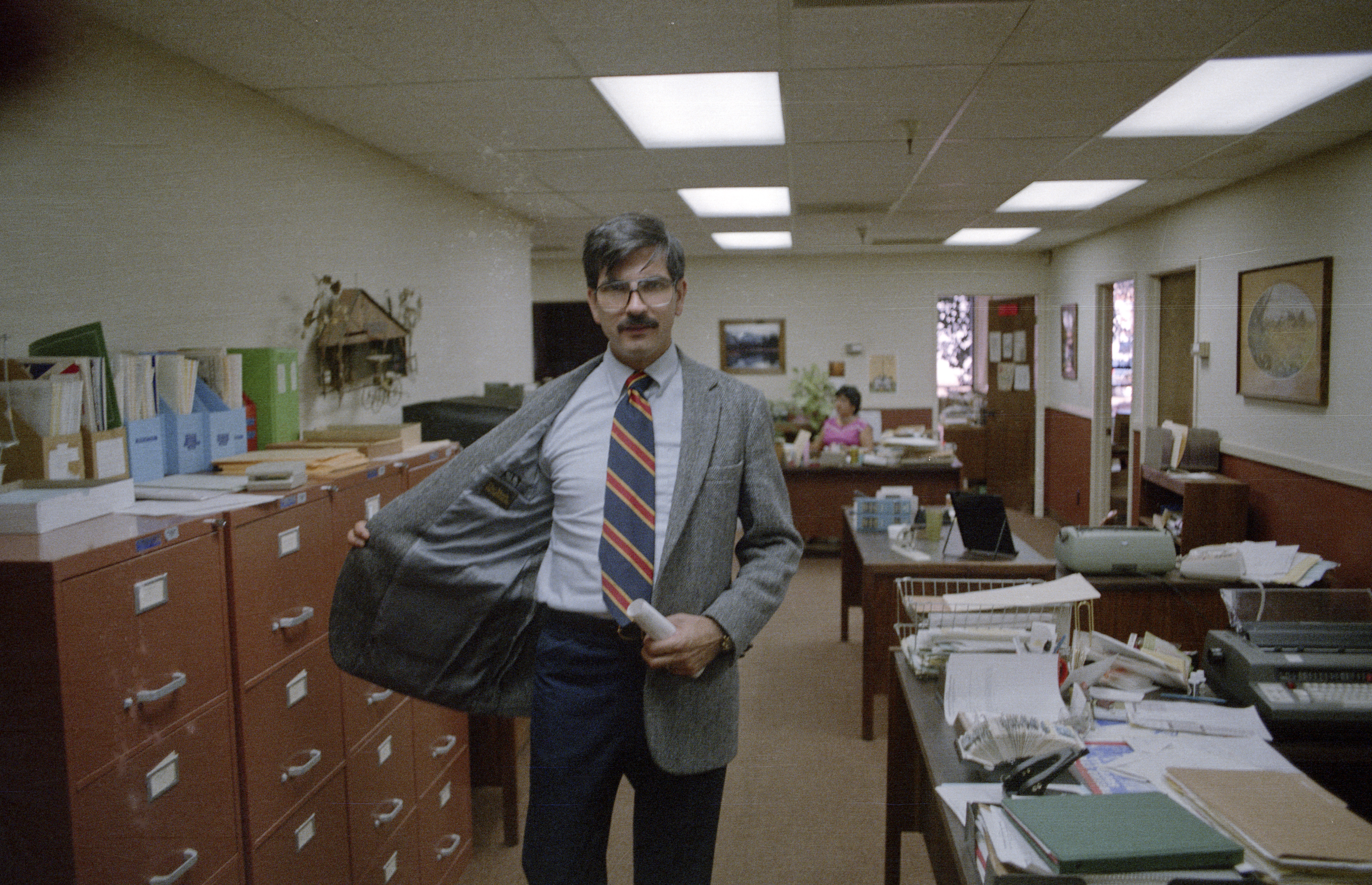 William Leifer opening right side of his coat jacket; Alice Gutierrez in background Filing cabinets and secretarial stations