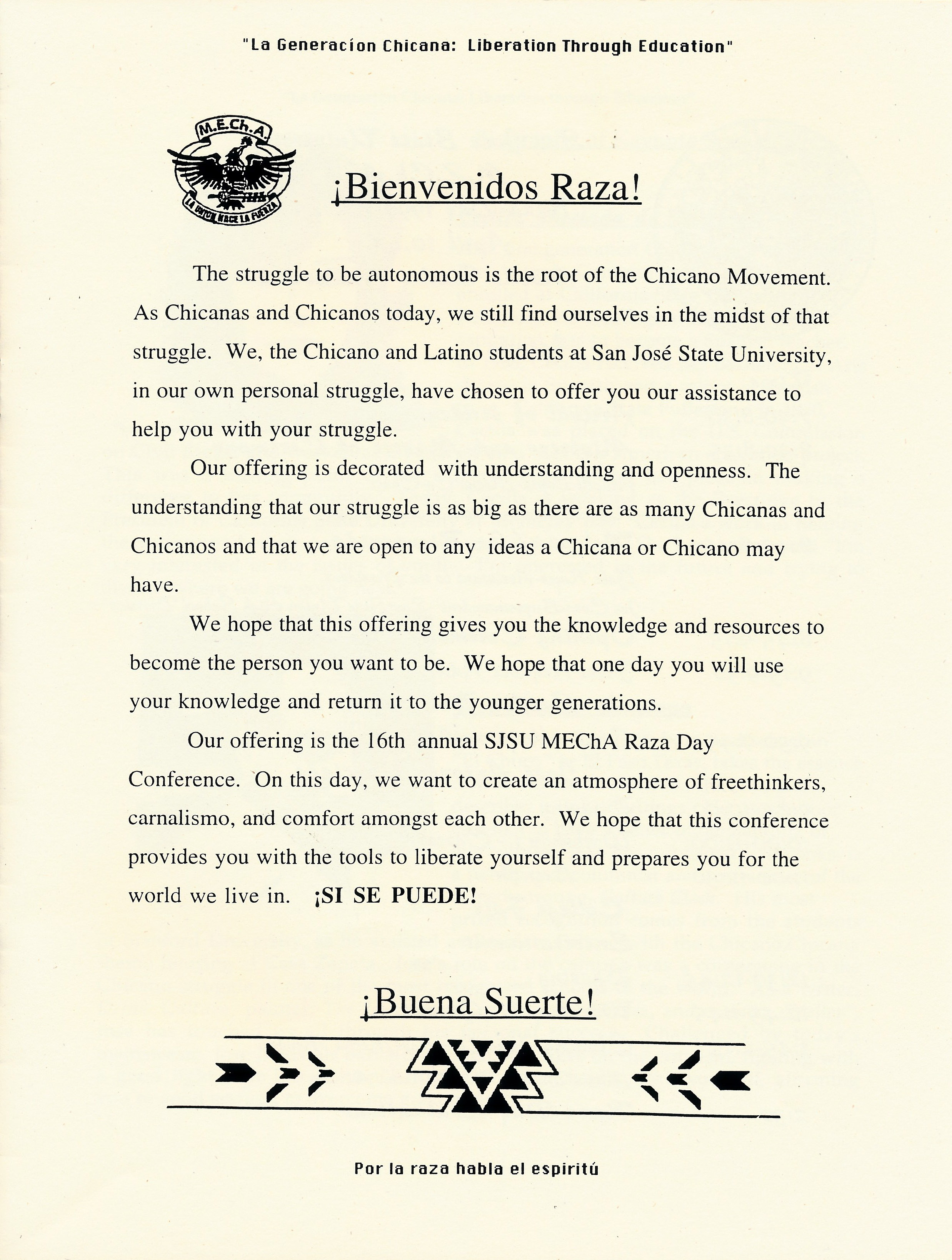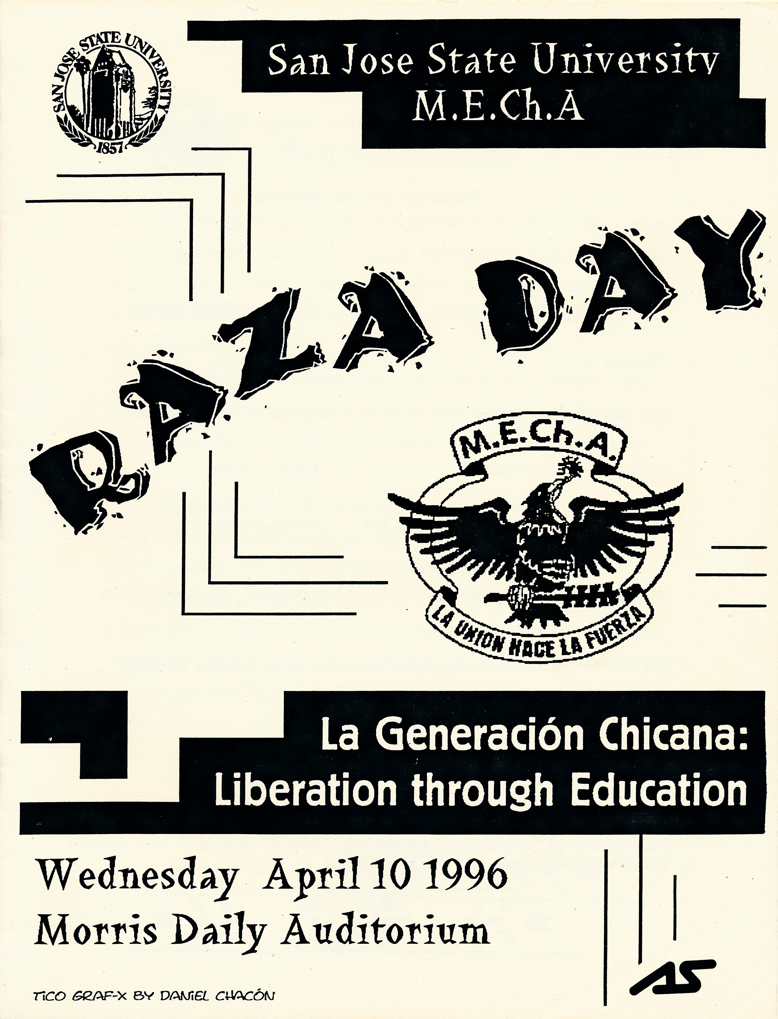 Program for Raza Day, presented by SJSU Movimiento Estudiantil Chicano de Aztlán (M.E.Ch.A.). Held on Wednesday, April 10, 1996 at San Jose State University in the Morris Daily Auditorium. The Mistress of Ceremony was Araceli Lopez (M.E.Ch.A. Co-Chair) and the Master of Ceremony was Rafael Chavez (M.E.Ch.A. Internal Representative). The event included a Welcome by Gabe Reyes (Assistant to the President) and Joe Coto (Superintendent, East Side Union High School District), the First Keynote Address by Cecilia Preciado de Burciaga, the Second Keynote Address by Jose Antonio Burciaga, Career and General Workshops, and a Closing by Jesse Contreras (M.E.Ch.A. Member) and Maria D.L.C. Romo (M.E.Ch.A. Advisor).