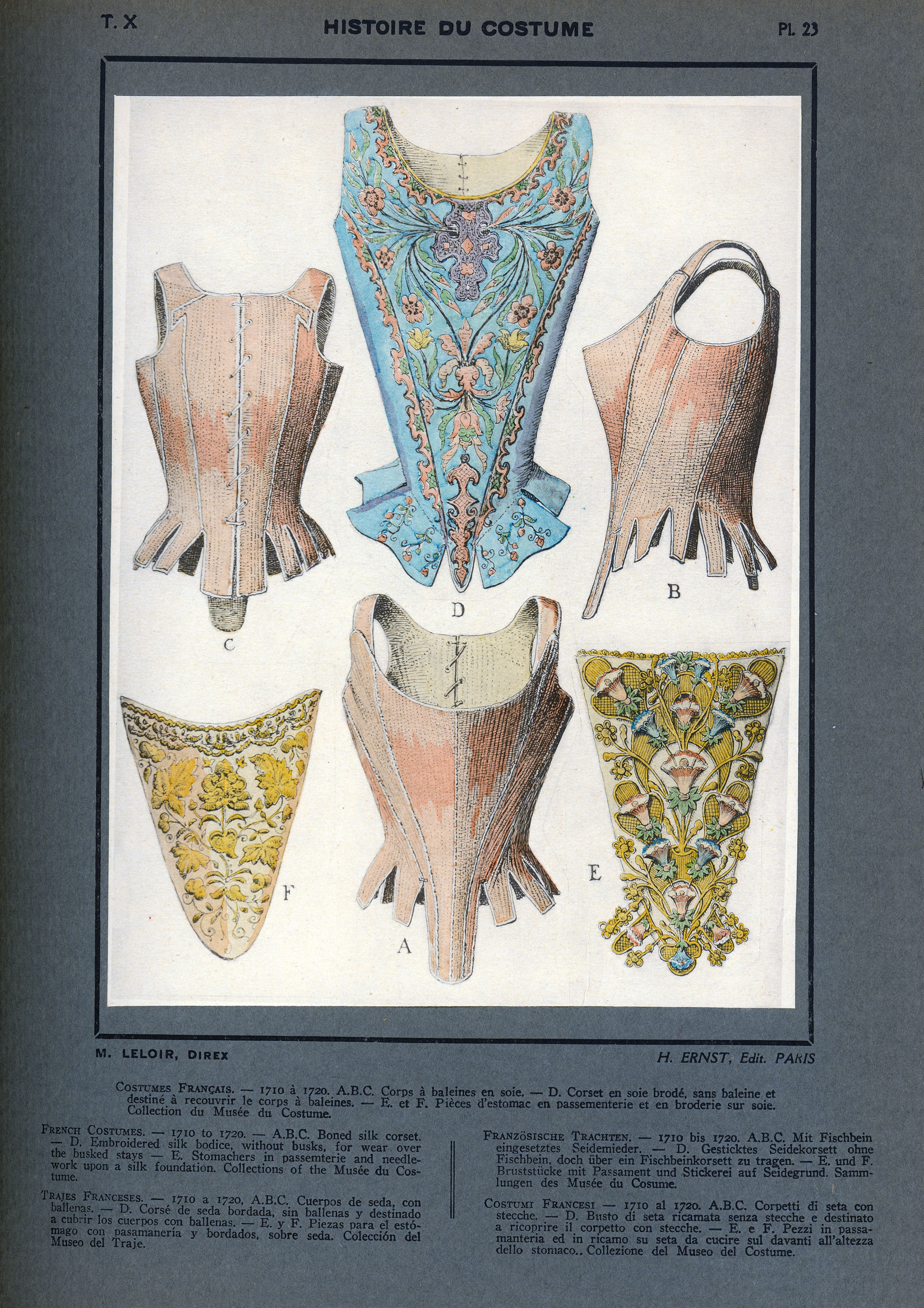 Illustrations of women's boned silk corset, embroidered silk bodice without busks and stomachers in passemterie and needlework upon silk foundation from 1710-1720 in France as drawn by Maurice Leloir.