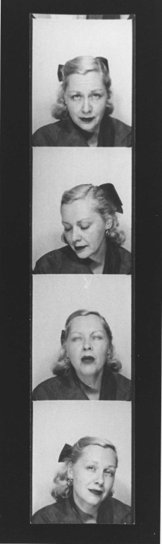 Four machine photos of Gwyn Steinbeck with various expressions. Taken at same time as the photograph strip of Nathaniel Benchley, number 0-060. Original is in the safe (in strip).