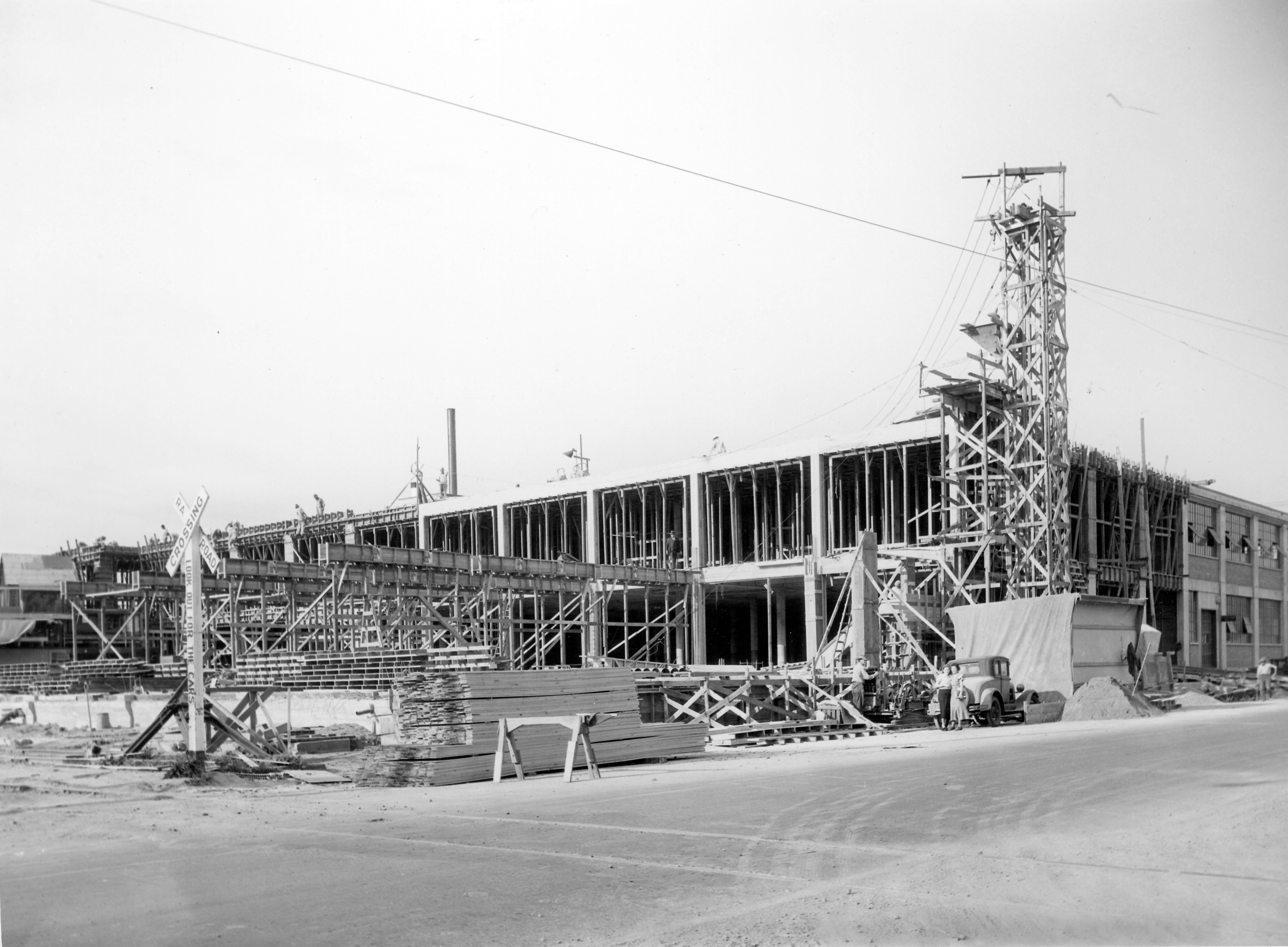 Building construction near railroad crossing. Public