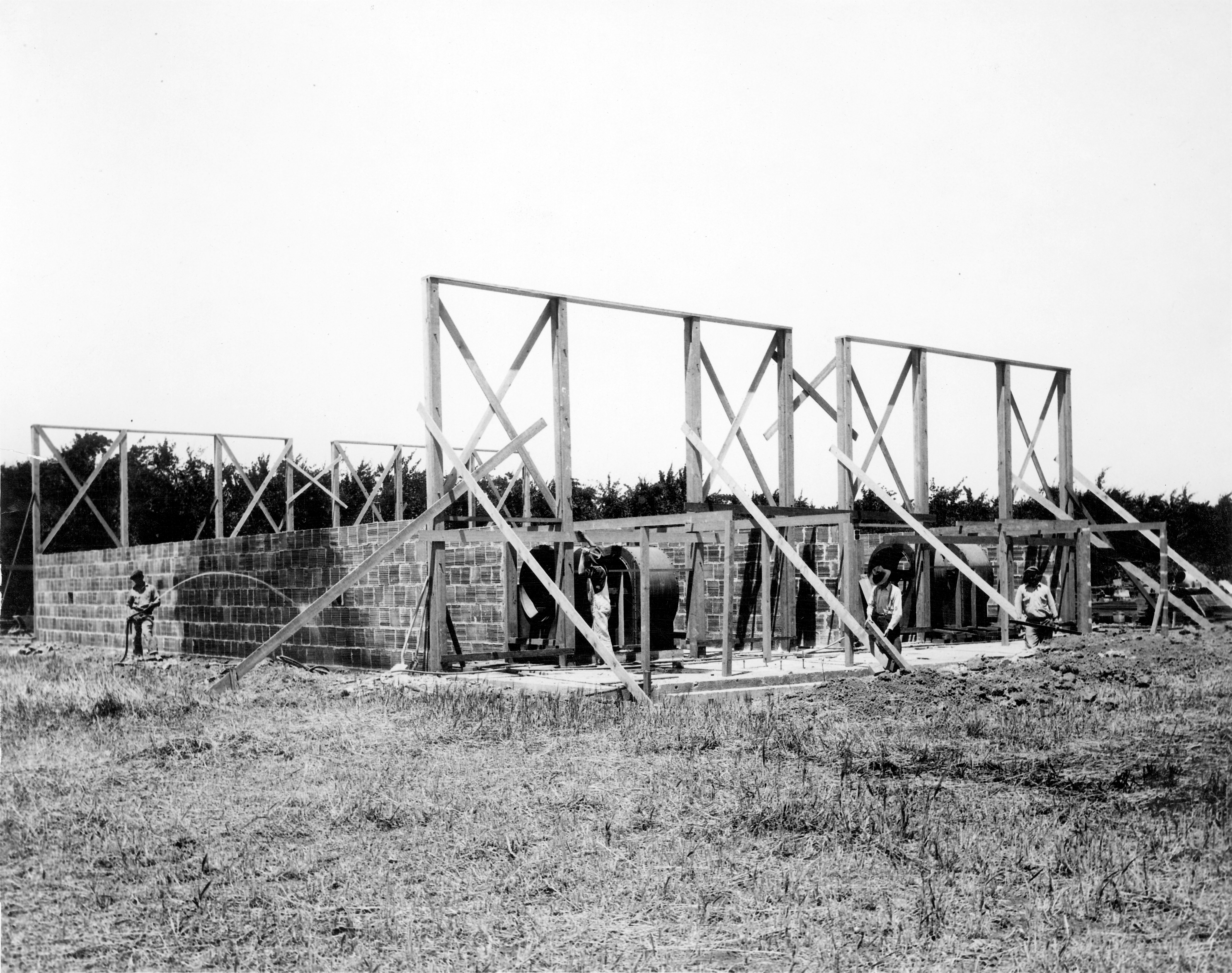Construction workers laying bricks at a construction site. Public