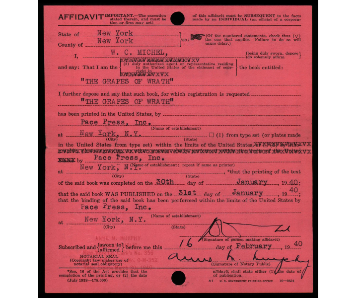 Grapes of Wrath application card for registration of copyright for film rights. Twentieth Century-Fox Film Corporation registration for screenplay copyright