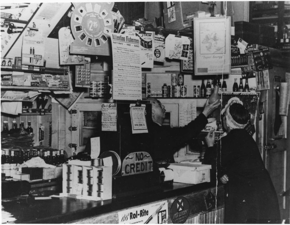 Sam Chan behind counter of Wing Chong Market on Cannery Row. Chan worked for Yee family for many years. Steinbeck called this Lee Chong's Heavenly Flower Grocery in Cannery Row and Sweet Thursday.
