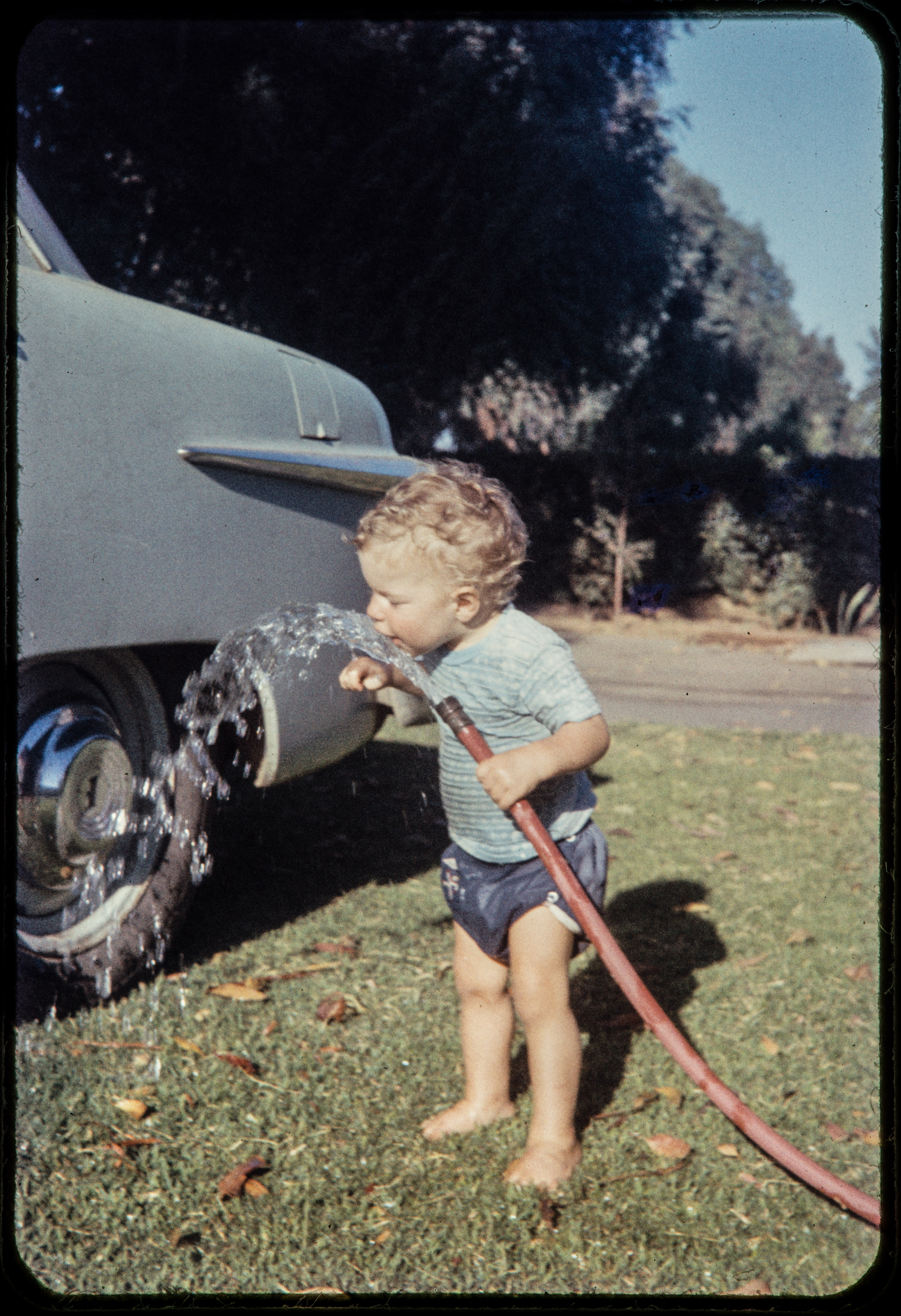 Joel drinks from hose, a habit learned from his father.