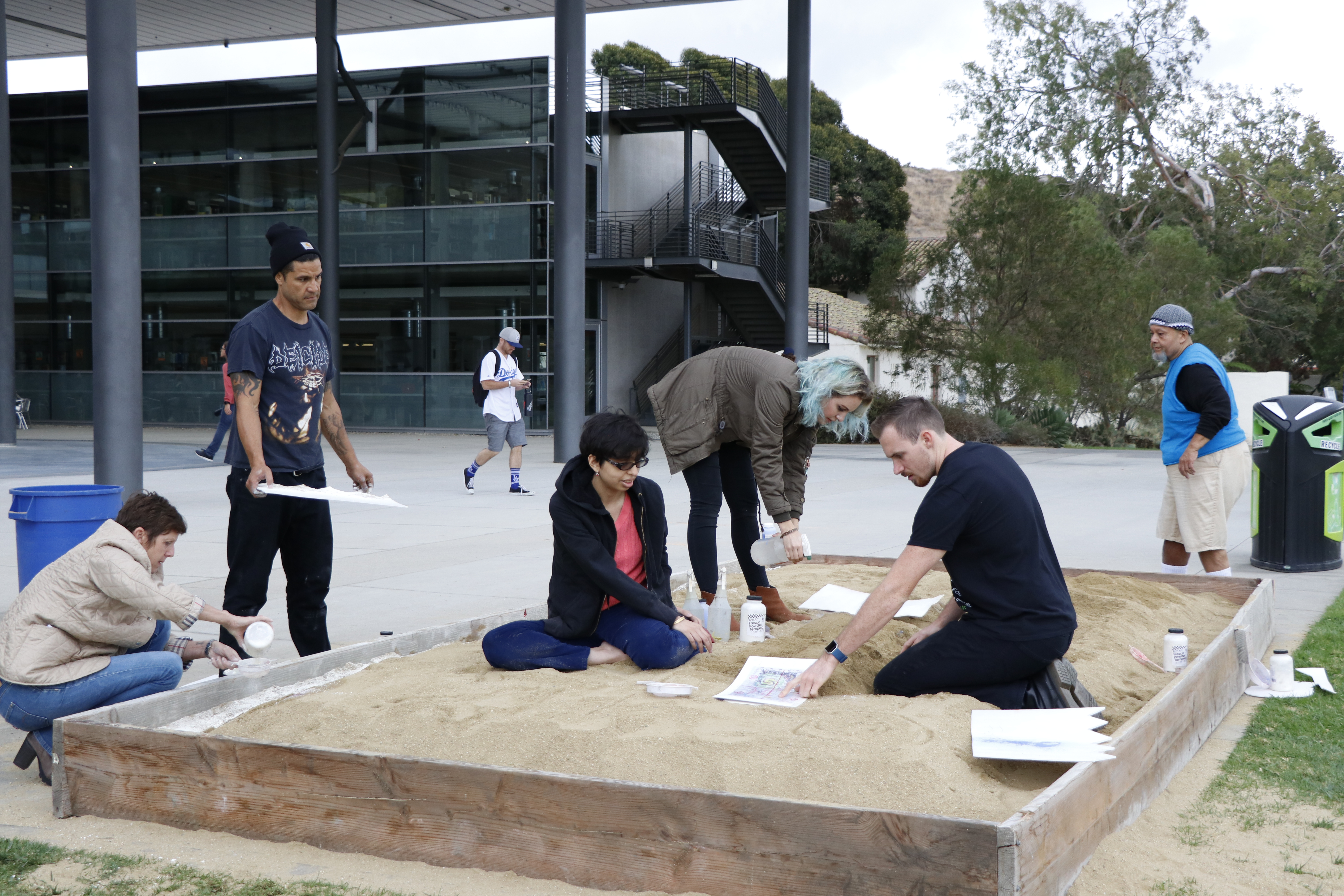 CI students help Chicano artist, Leo Limon, create a sand sculpture for the 2017 Day of the Dead Celebration.