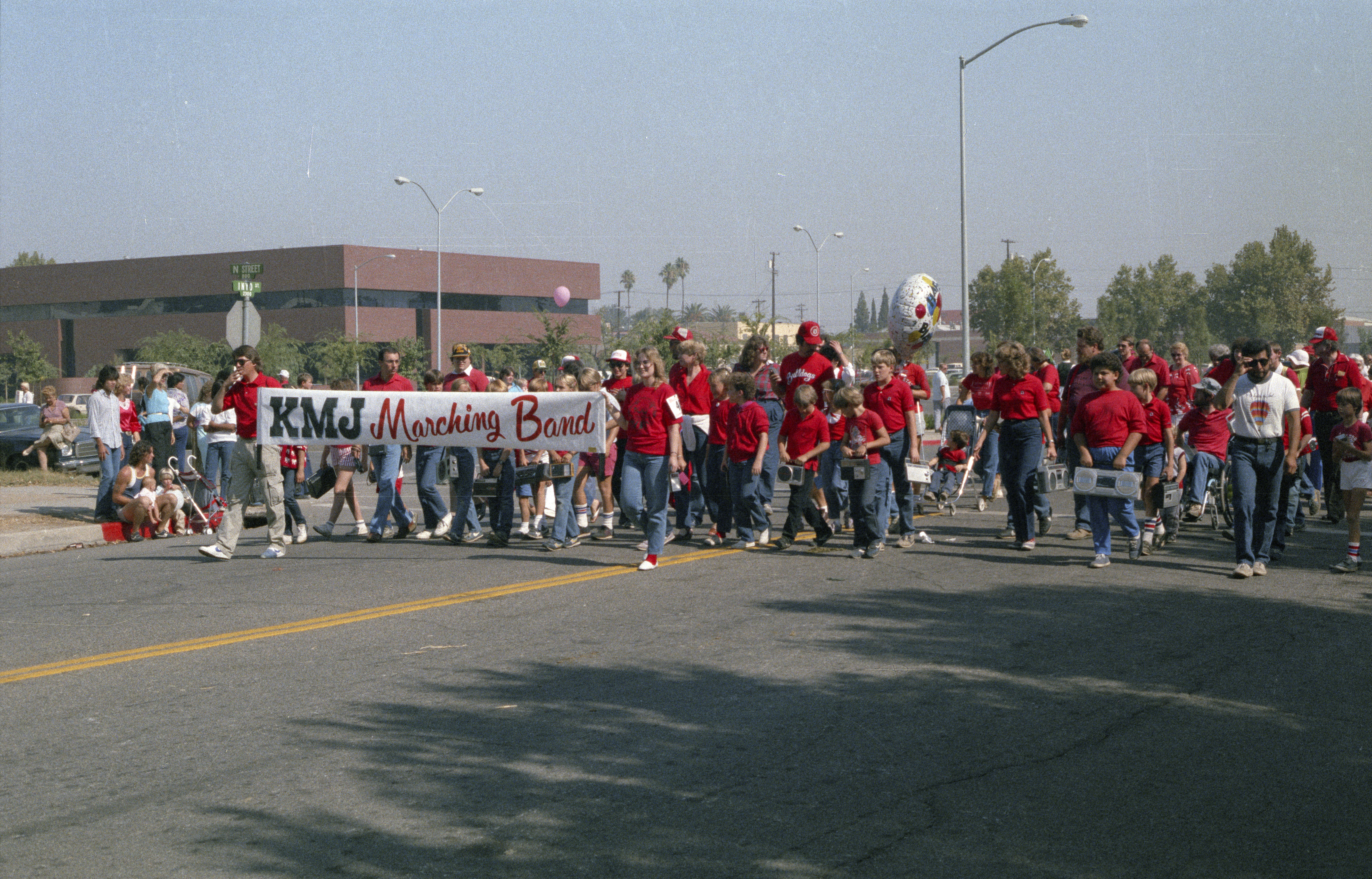 KMJ Marching Band with citizens wearing red T-shirts and carrying portable radios playing patriotic music broadcasted on KMJ radioon KMJ radio