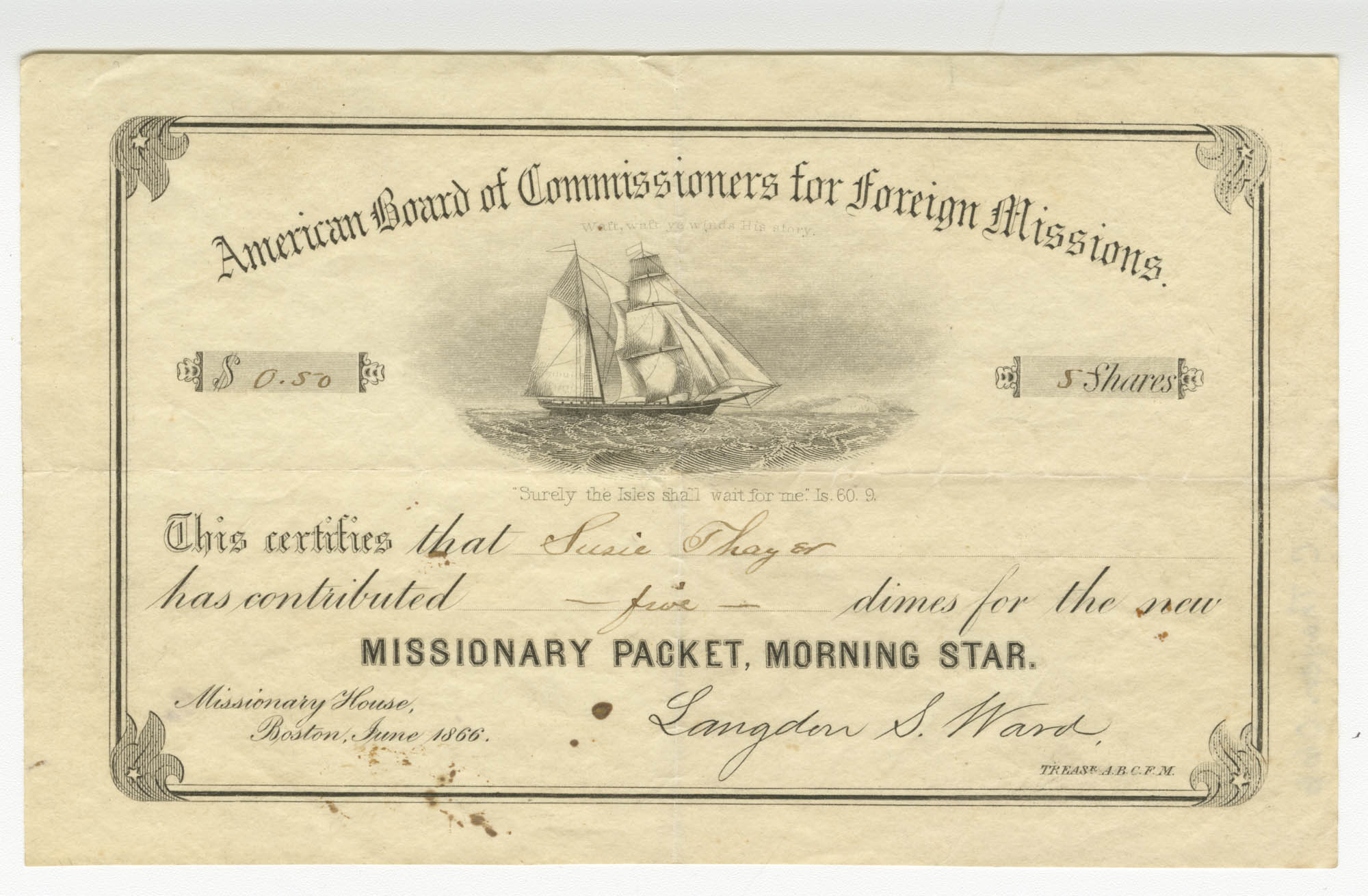 Receipt given to Susan ("Susie") Thayer for "five dimes" given to the Missionary Packet, Morning Star from the American Board of Commissioners for Foreign Missions, dated Boston, June 1866.