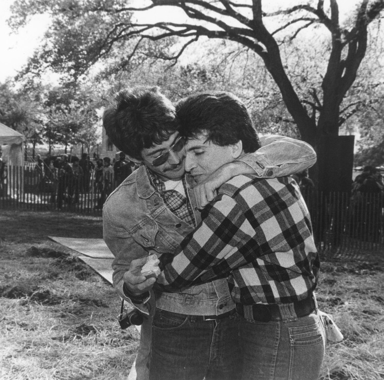 Two men hugging
