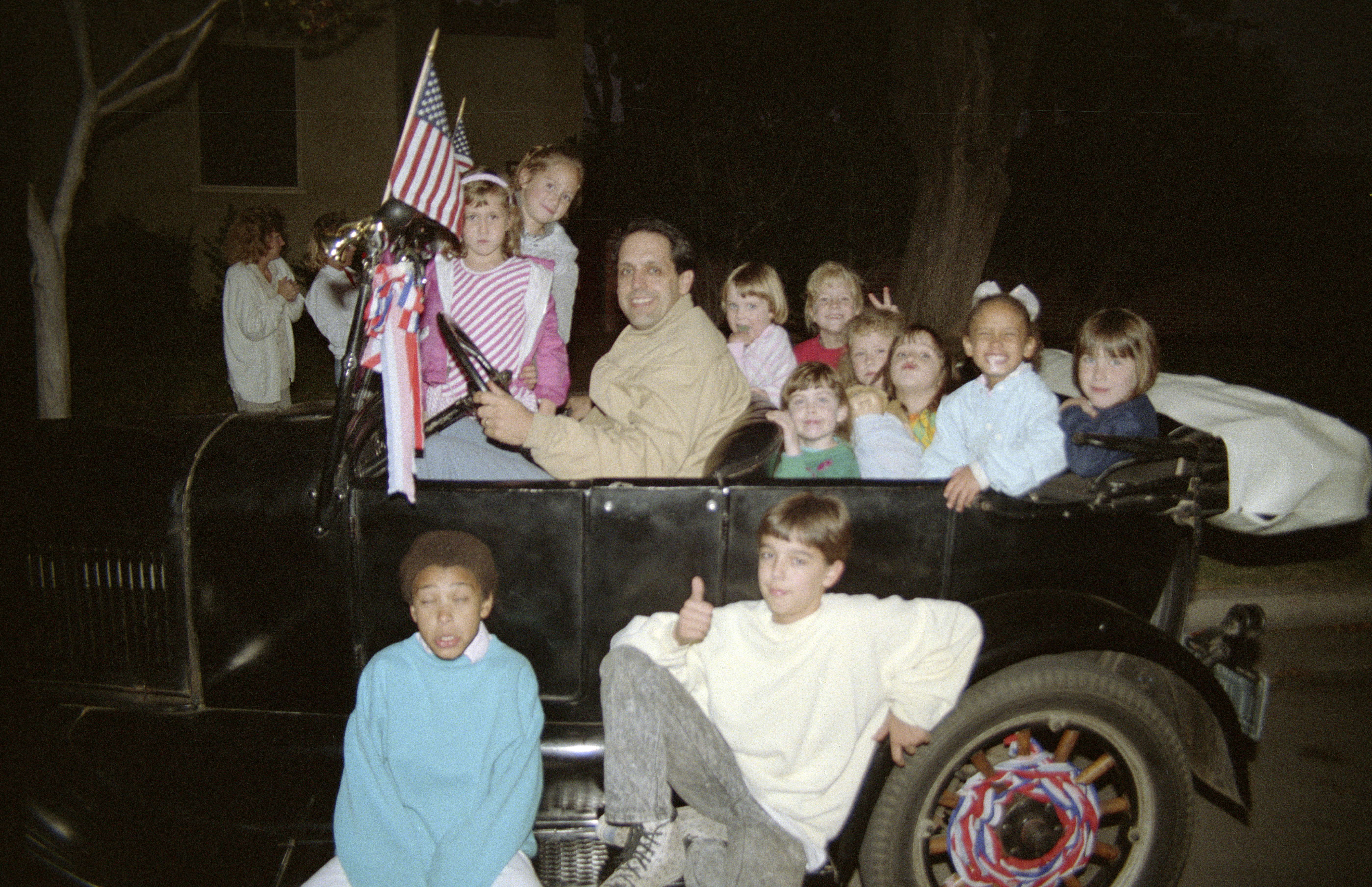 Howard Watkins in Model T Ford driver's seat; 9 children in car; ?and Adam Watkins sitting on running board
