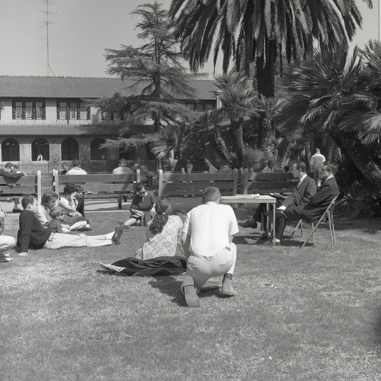 Students sit on the grass on the quad lawn at San Jose State College. Many students are sitting on the grass facing two men sitting behind a table.