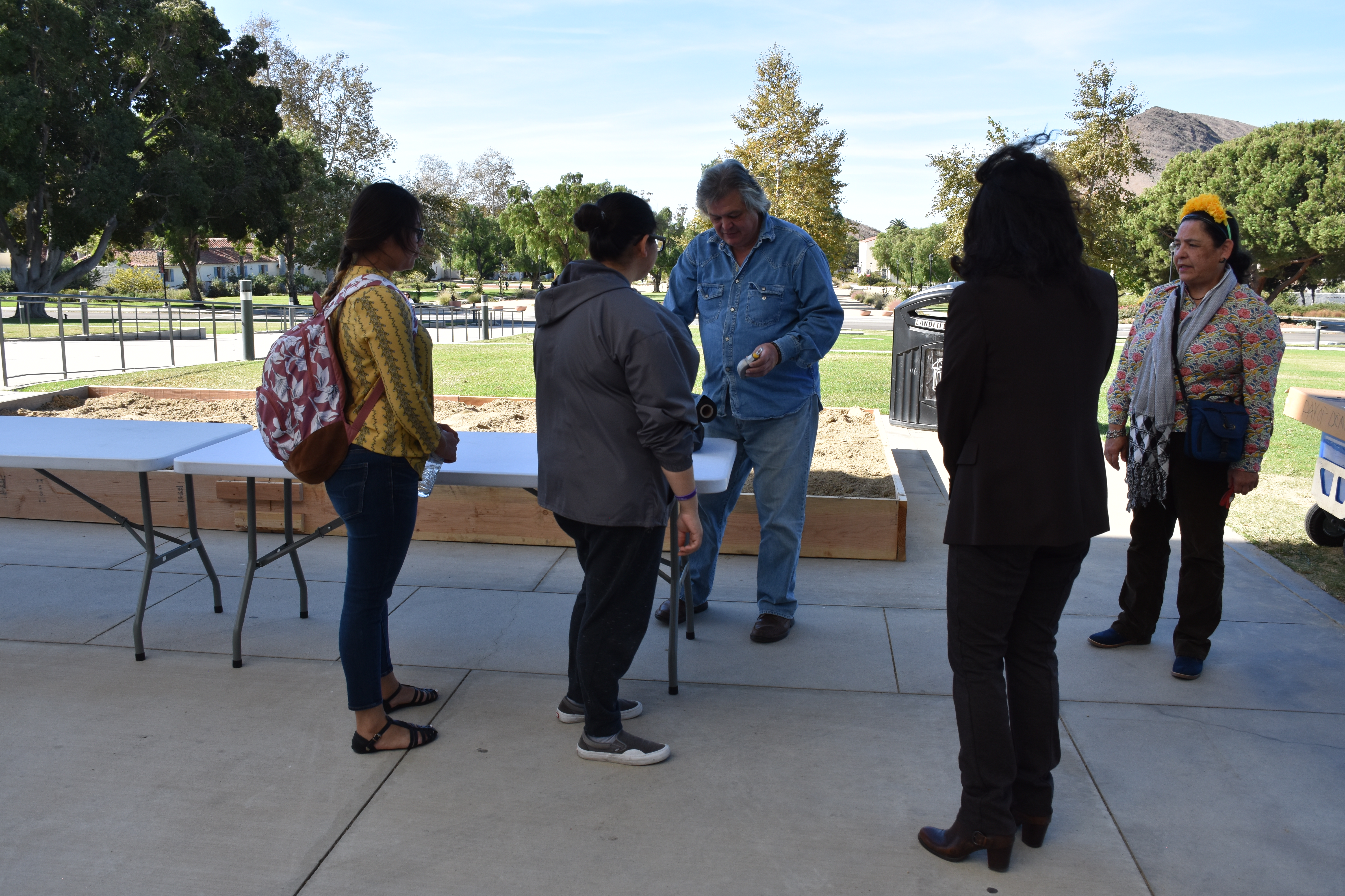 Artist Jose Antonio Aguirre speaks with students for the 2018 Day of the Dead celebration.