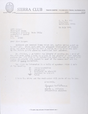 Tehipite Chapter of the Sierra Club; Mineral King; Correspondence; 1971