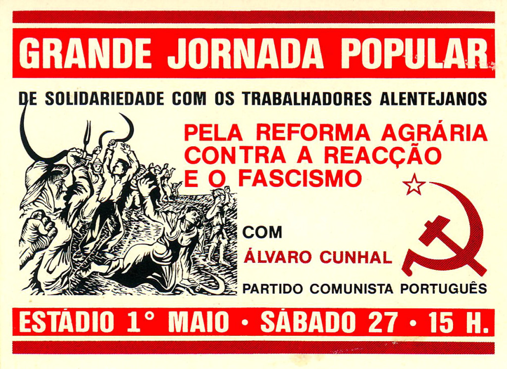 Grande jornada popular de solidariedade com os trabalhadores alentejanos Pela reforma agrária Contra a reacção e o fascismo Com Álvaro Cunhal Estádio 1º de Maio, Sabado, 27, 15H Partido Comunista Português (PCP) Lisboa 27 de Setembro de 1975 Huge people’s day of solidarity with Alentejo workers For land reform Against reaction and fascism With Álvaro Cunhal May First Stadium, Saturday, 27 [month not given], 3 pm Portuguese Communist Party Lisbon 27 September 1975 The PCP was founded in 1921, but was outlawed throughout the dictatorship period 1926-1974. Álvaro Cunhal was already the de facto leader of the PCP when he was arrested by the Salazar regime in 1949. He escaped prison in 1960 and fled the country to exile in Moscow, where he was elected secretary-general of the PCP in 1961. He remained in exile until the Carnation Revolution made it possible for him to return to a hero’s welcome in Lisbon at the end of April 1974.