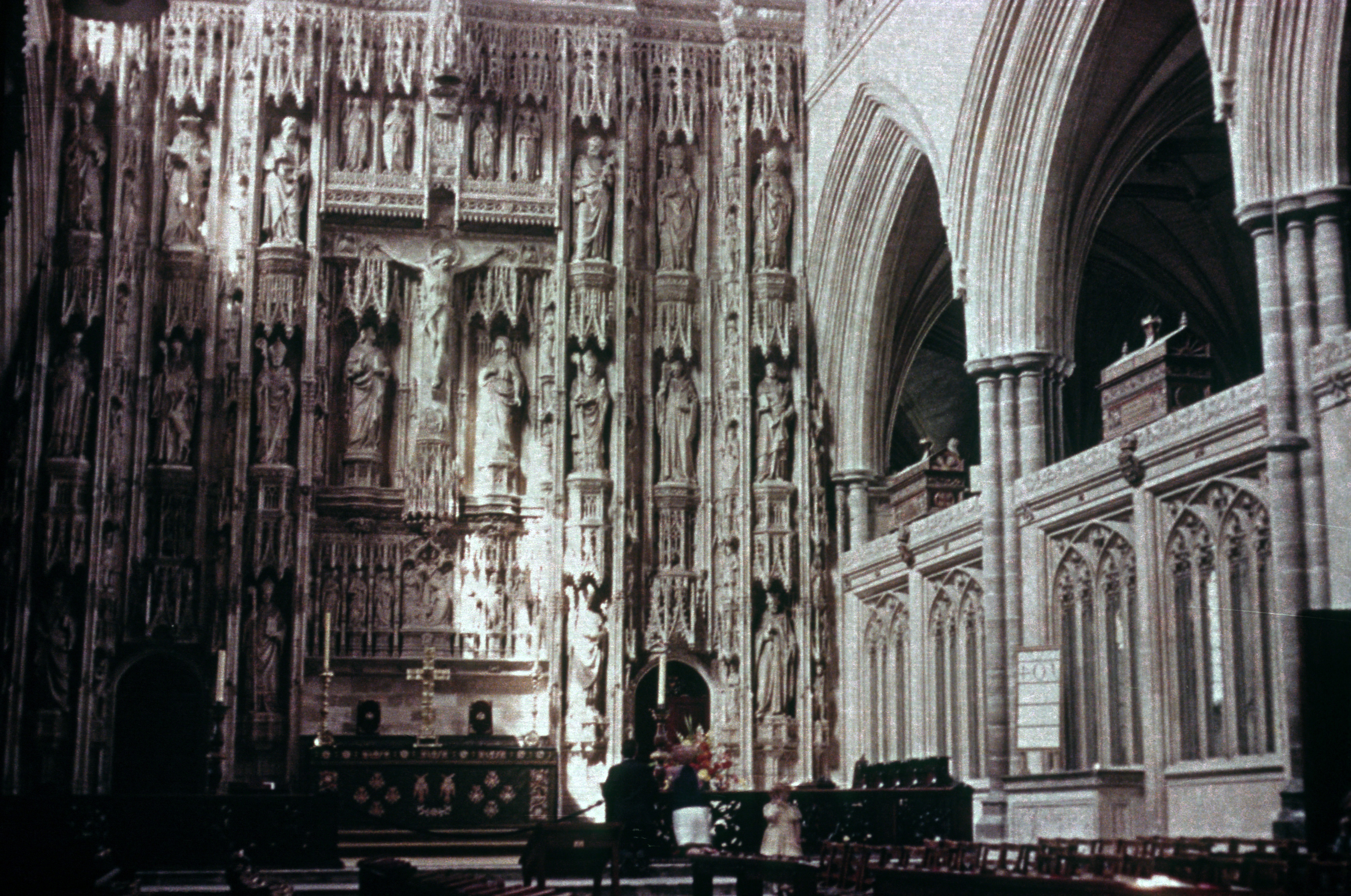 Although so great an effort had been expended during the fourteenth century in improving the nave, the choir at Winchester had remained much as it had been left in 1360, after removal of the Norman apse had followed an Early English reconstruction of the eastern arm. The skills of chantry building can be seen in this magnificent reredos, erected by Bishop Fox behind the high altar. Although much defaced and mutilated during the Reformation, when all the statuary was removed, it has remained intact as a structure. At the top of the stone screen, which was erected between the piers, can be seen a classical frieze, evidence of the Renaissance to come. Above the screen are chests containing the bones of Saxon Kings and bishops, including those of King Canute and his queen, which have been in the cathedral from its earliest days.