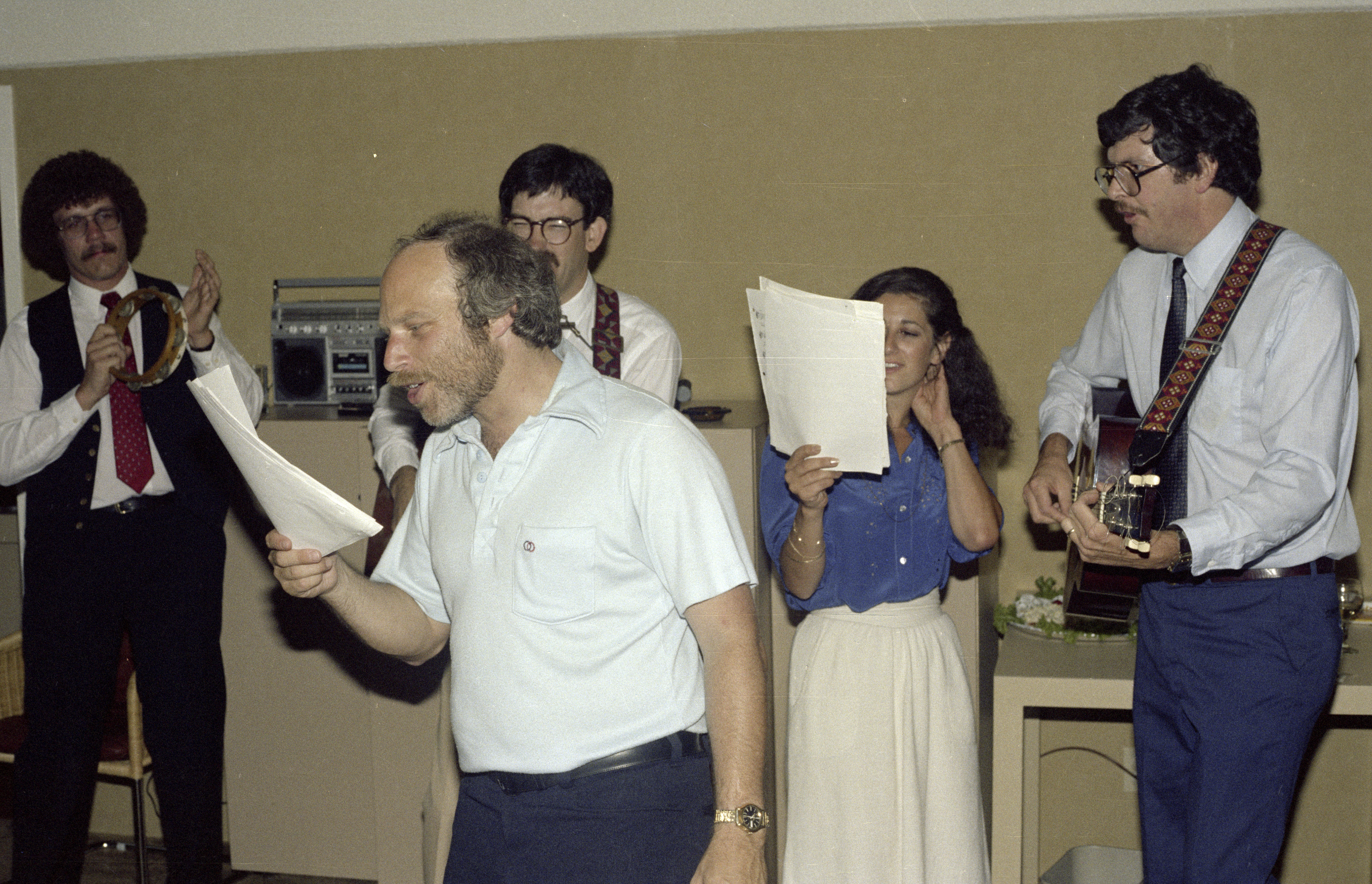 Steve "Elmo" Rau, Frank Gumpert, David Atkinson, Carol Rau holding sheet music, and David Morse with guitar with guitar all singing