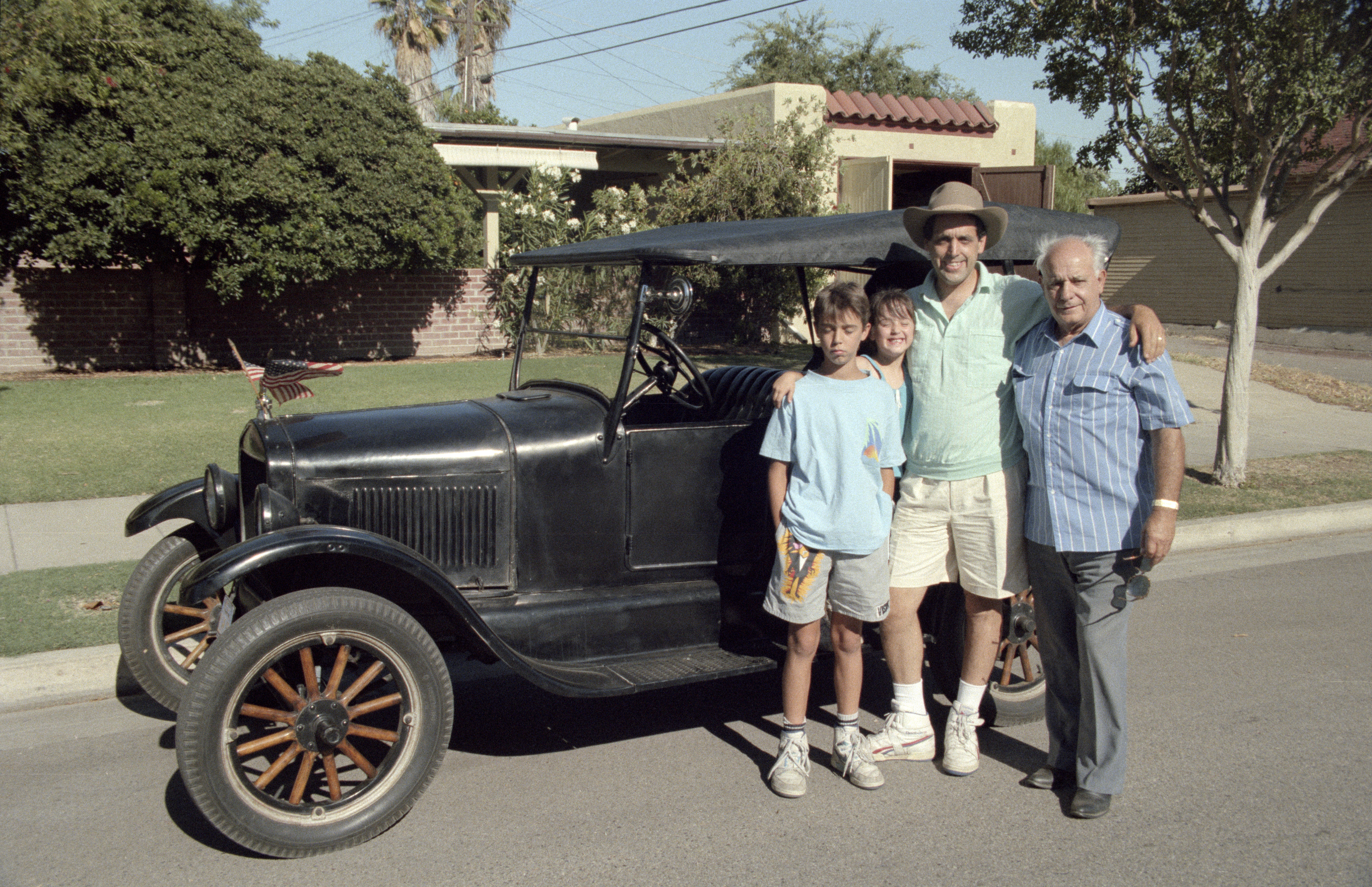 Adam Watkins, Robin Watkins (standing on running board, Howard Watkins and Albert Watkins by Model T Ford