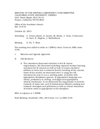 Minutes of the Writing Competency Subcommittee 10/22/2015