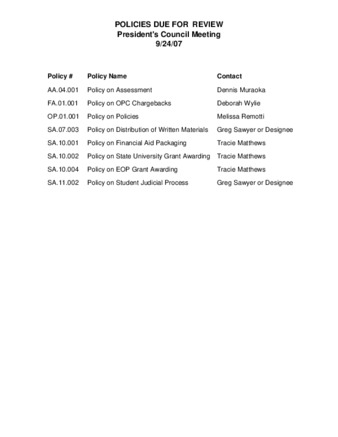 Policies Due for Review: President's Council Meeting 9/24/07