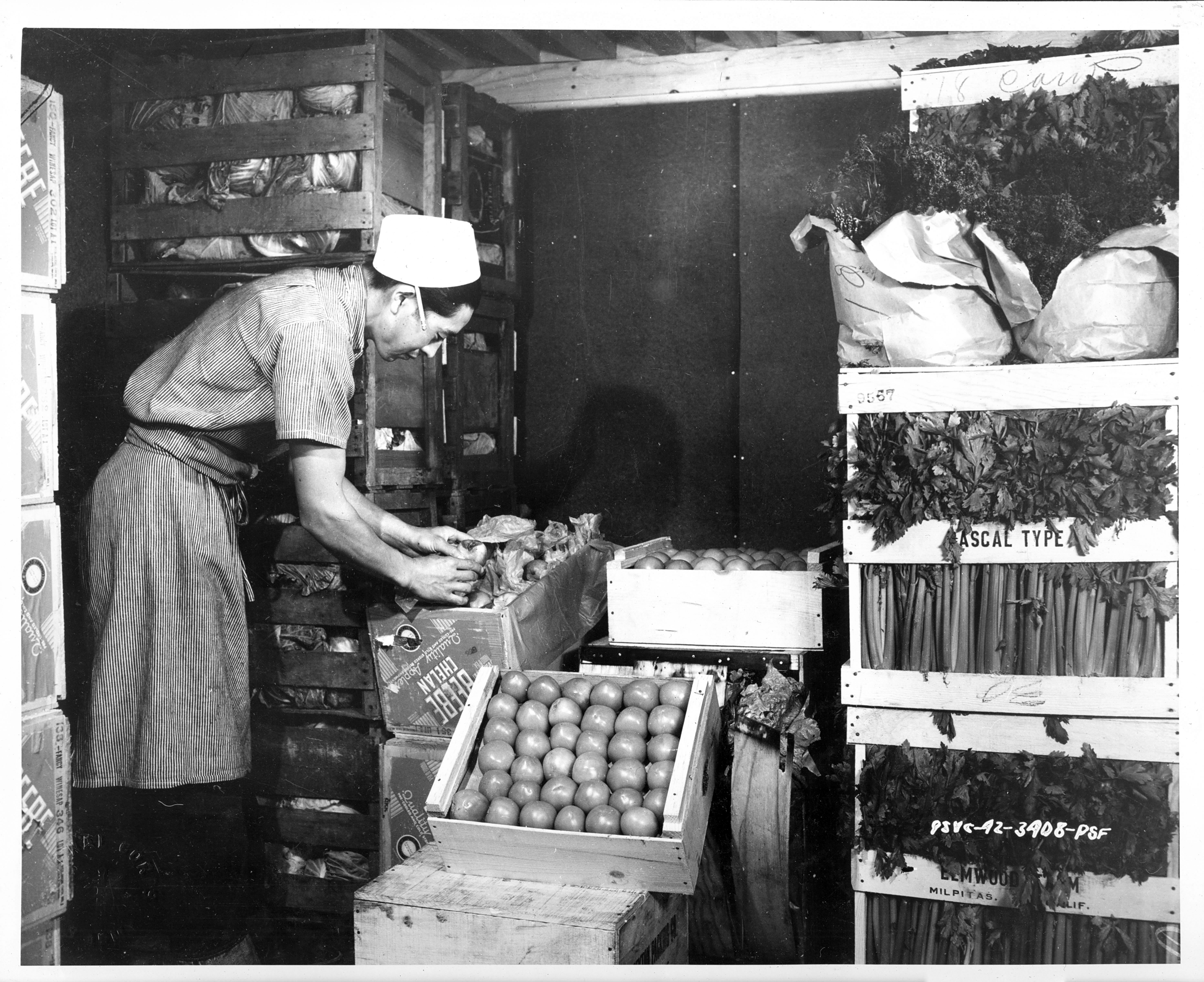 Photograph shows an evacuee checker inspecting foods at Fresno, California Assembly Center.