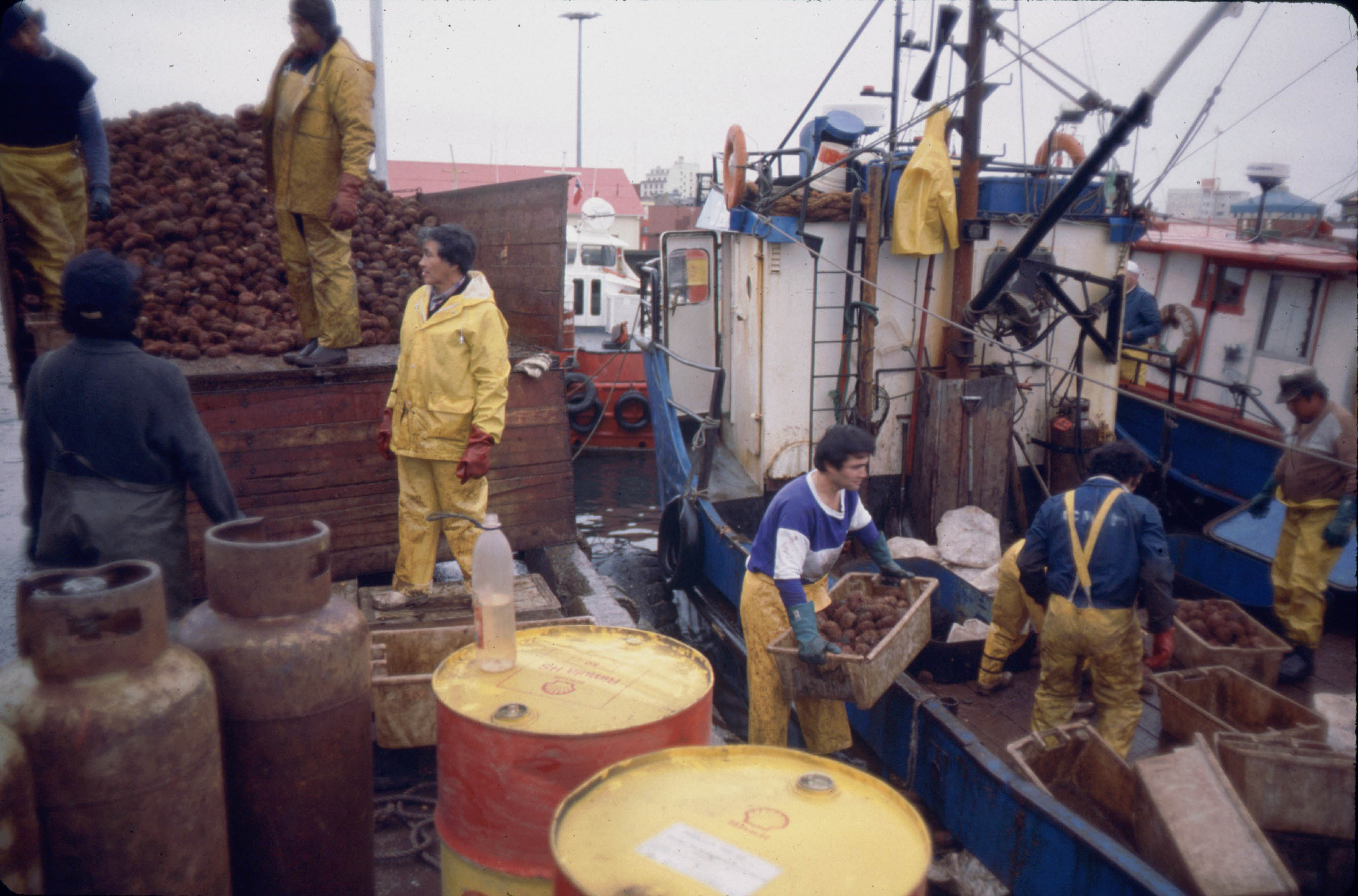 Offloading urchins, collected by divers, onto trucks in Punta Arenas, Chile, near Antarctica