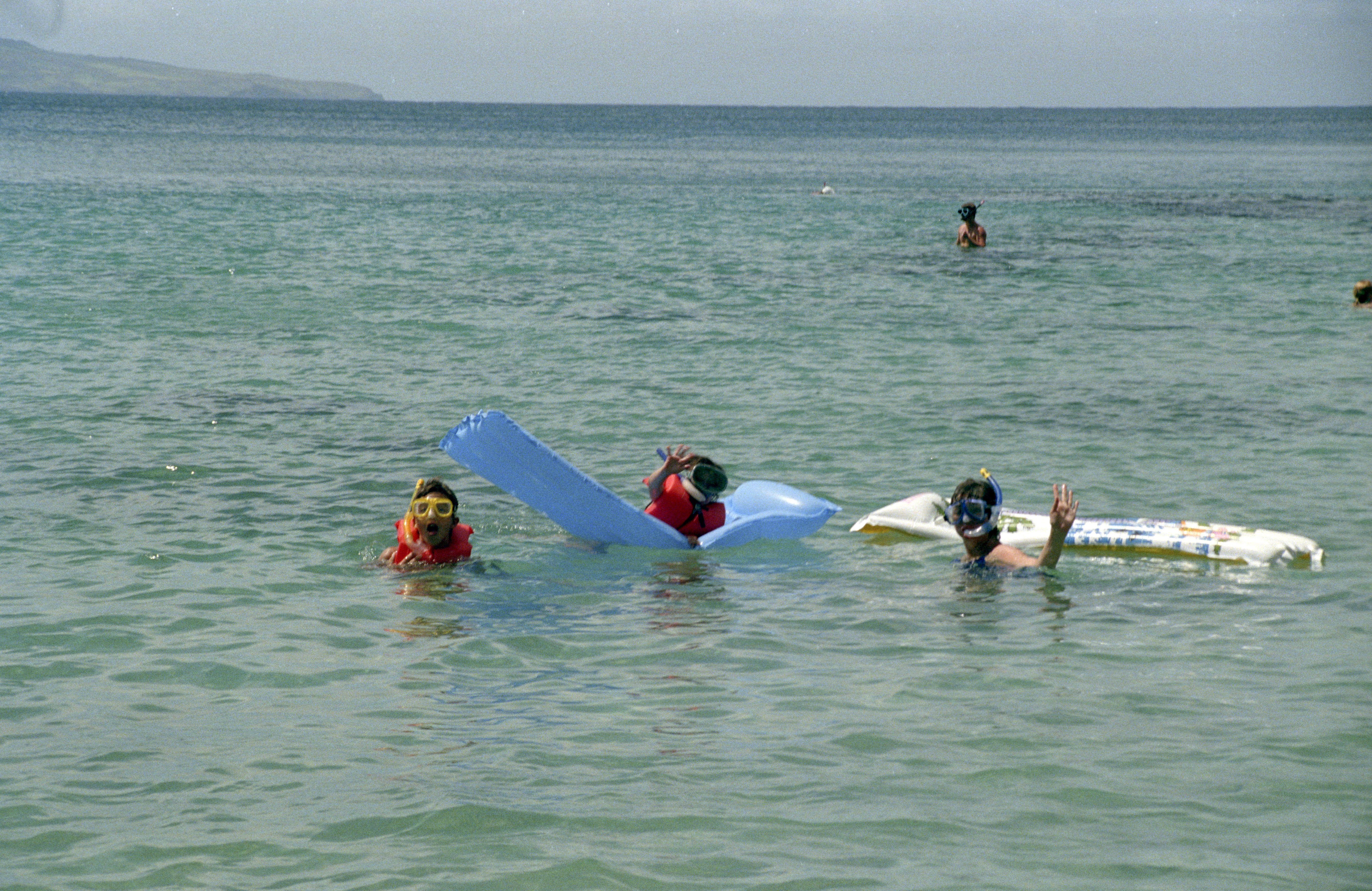 Adam, Robin and Howard wearing snorkels in water; Robin on blue air mattress; Howard holding floating air mattress